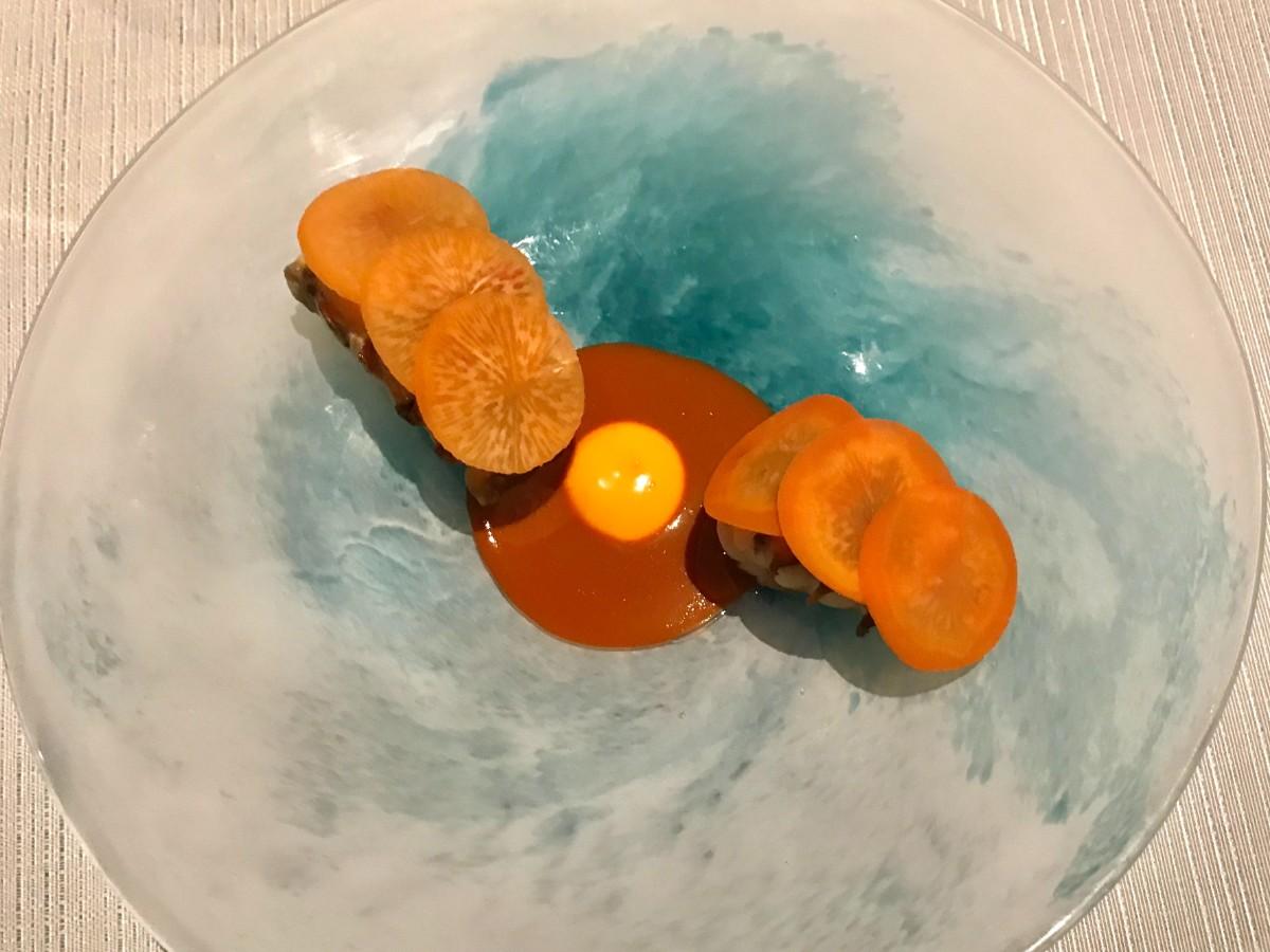 上桌看到紅蘿蔔先默哀三秒,因為最怕的就是紅蘿蔔,秉持著尊重菜單的心,還是要來吃看看…結果和也怕紅蘿蔔的友人,全都吃光光了,可見這一道有多好吃!蝦蛄又稱做小龍蝦,肉質鮮美Q彈,再來是大魔王紅蘿蔔Purée,服務生說不會有紅蘿蔔的生味,但我還是吃到了,不過法餐本來就沒有在拆開來吃,purée帶有明亮酸度,中間醬汁則是帶有濃濃的蝦頭膏香氣,發酵辣椒是增添風味,並不會辣,整體搭配在一起重量剛好,味道融合的也很好,重點是紅蘿蔔味在組合起來一起吃的時候就這樣消失了!這道大家都愛~
