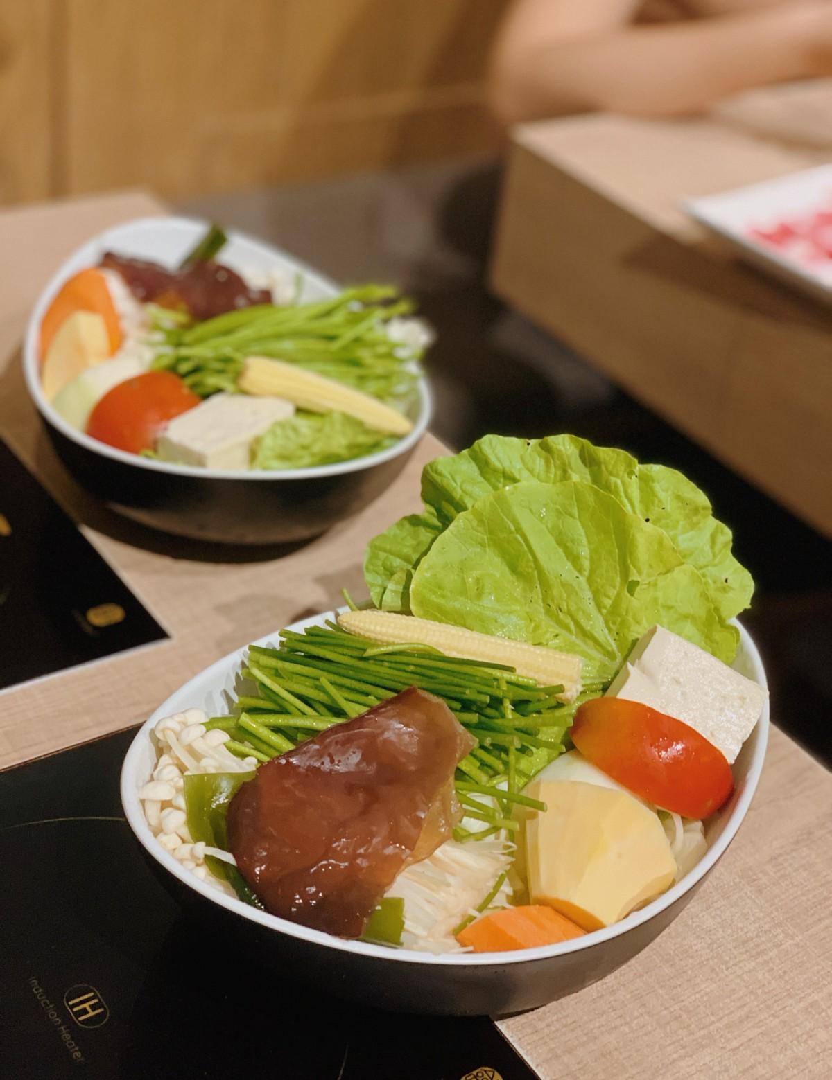 我選的是「蔬果雞湯」,對面友人選「法式白蘭地燉雞湯」,因為大家清一色都想點蔬果雞湯,她說想要大家吃吃看另一個湯底才點的 ; 結論是大家都覺得蔬果雞湯比較合胃口。