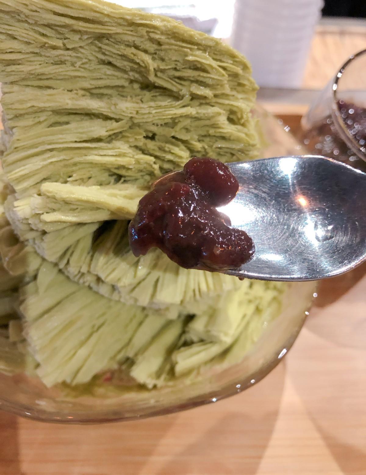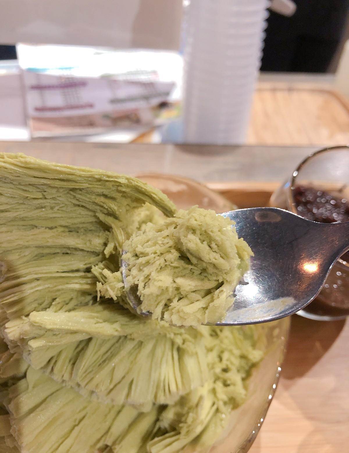 宇治抹茶雪花冰,除了本體的純味抹茶雪花冰之外,還有一杯有微微咖啡味的蜜紅豆以及煉乳,原味的抹茶雪花冰甜度不高,抹茶味濃郁卻不苦澀,身為抹茶控覺得非常滿意,連融化之後的抹茶冰都是深深的綠色呢,可見他們的用料非常實在,雖然不知道為什麼他們家的紅豆要加入咖啡一起煮,但吃起來滿特別的,但咖啡味算重的,所以不喜歡咖啡味的朋友可能需要斟酌一下,紅豆的口感綿密又保有顆粒,讓口感上不會太過單調,非常推薦喜歡抹茶冰的朋友來嘗鮮喔ε٩(๑> ₃
