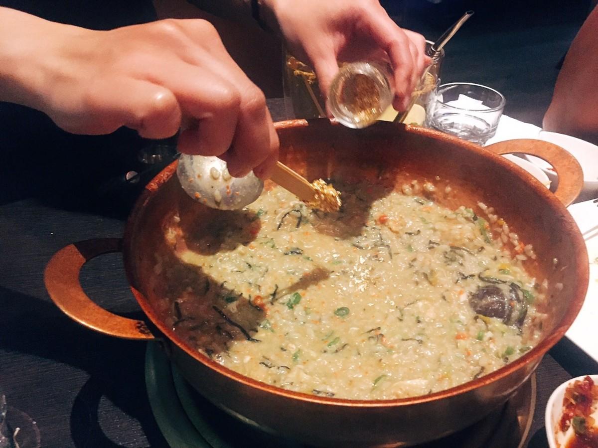 熬煮好後,店員居然拿出金箔撒在稀飯上方~