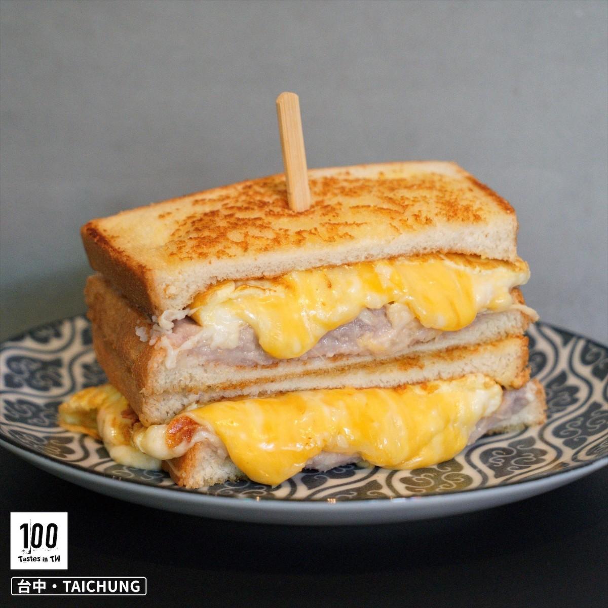 吐司抹上奶油後在爐台上香煎,爆漿芋泥蛋的芋泥餡給得很大方,還吃得到芋泥塊的顆粒感,搭配流瀉而下的爆漿起司超吸睛。