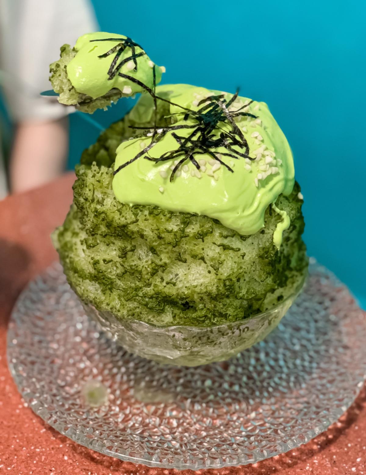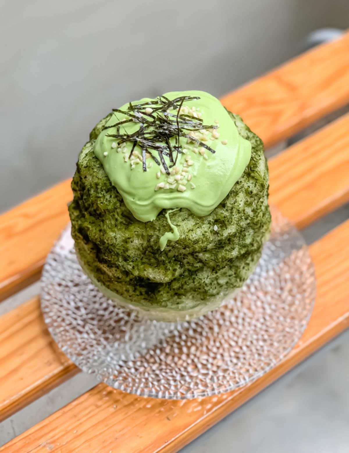不到200這個份量我覺得很可以!使用小山園抹茶但不是苦的喔,屬於大眾抹微甜的程度,感覺有點像靜岡,上面的抹茶奶蓋是可以吃到抹茶香的,冰體的話味道比較淡,這款是鹹甜搭配超級特別,上面灑了海苔絲沒有突兀,肉鬆也是灑上去吃的看自己要不要加,肉鬆配海苔感覺是稀飯才會出現,配上抹茶卻不會奇怪欸,還好抹茶不是苦的不然搭起來一定很怪,吃到裡面還有QQ的抹茶凍