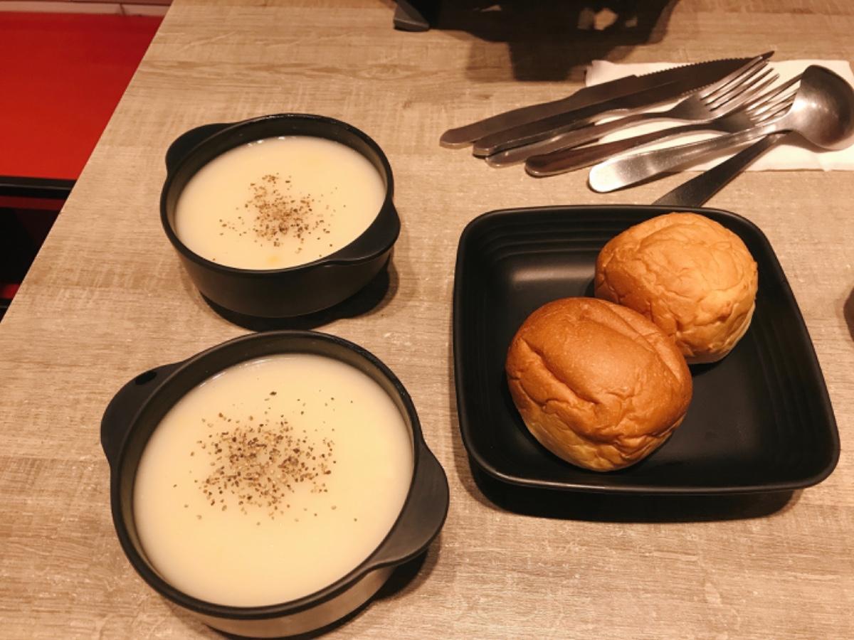餐點附餐包跟一碗濃湯 但熱河店不能換酥皮濃湯😢店內紅茶無限暢飲♾