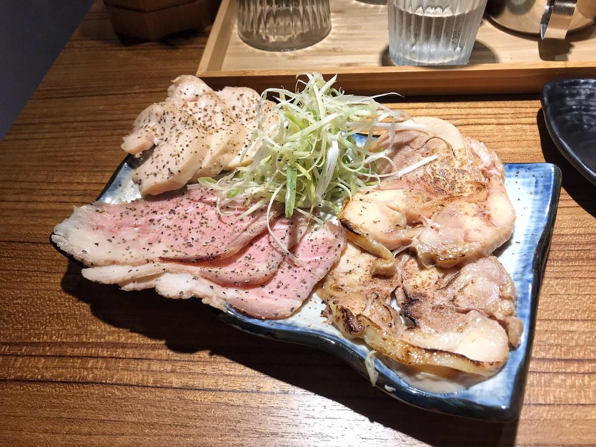 總共有三種叉燒,雞胸叉燒灑上胡椒簡單調味,口感普通不乾柴;炙燒雞的炙燒香很誘人,可惜偏乾;薄片叉燒沒什麼口感、調味尚可。整體表現勉強及格,調味都不錯但是口感還可以再加強。