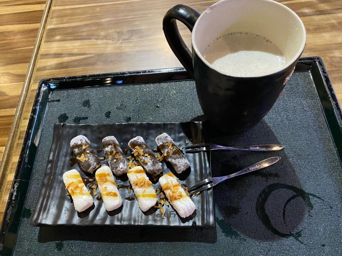 小小的一份,擺盤很漂亮啊!是黑糖和牛奶口味,拿來墊個肚子很不錯,芋頭牛奶也很推薦唷。