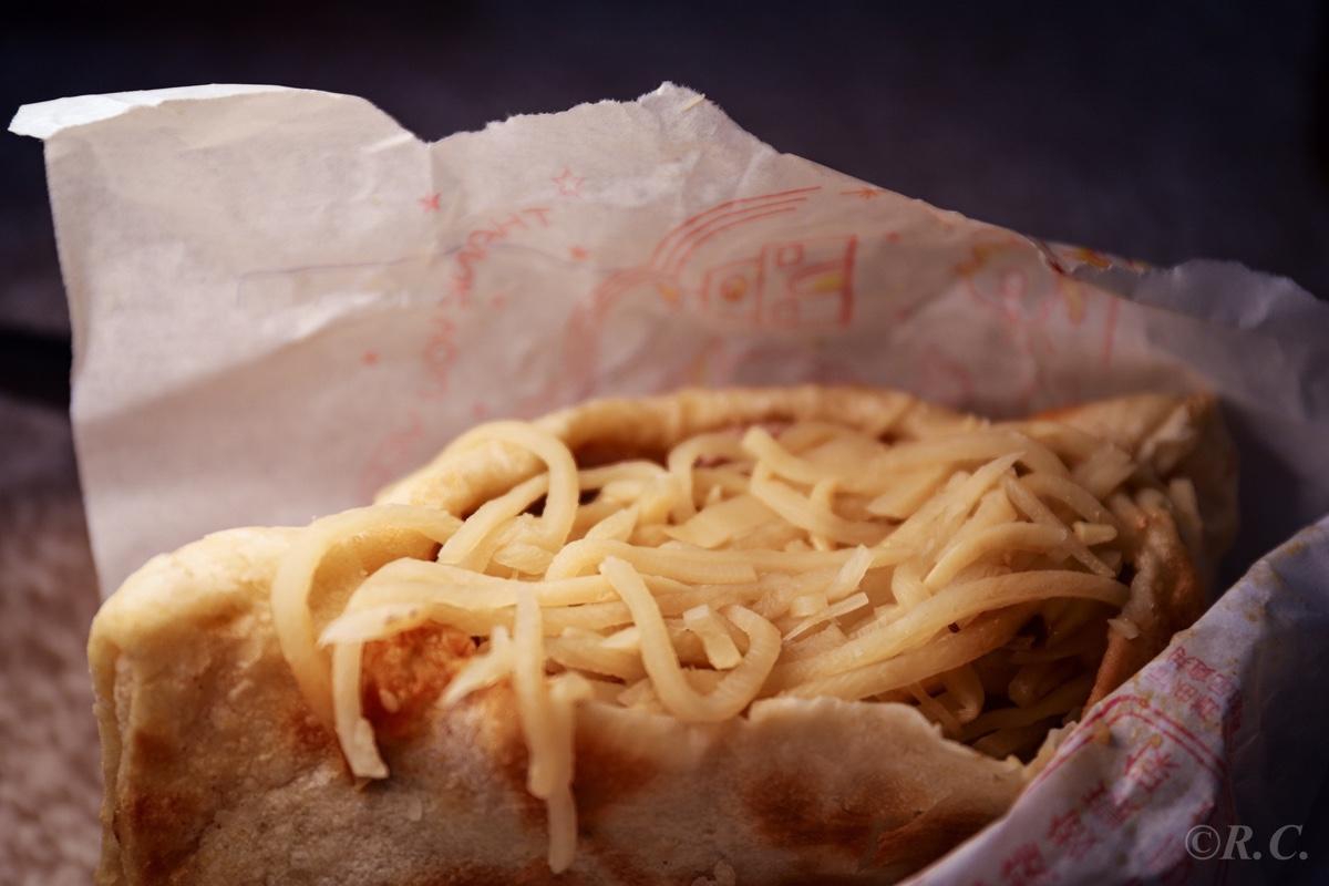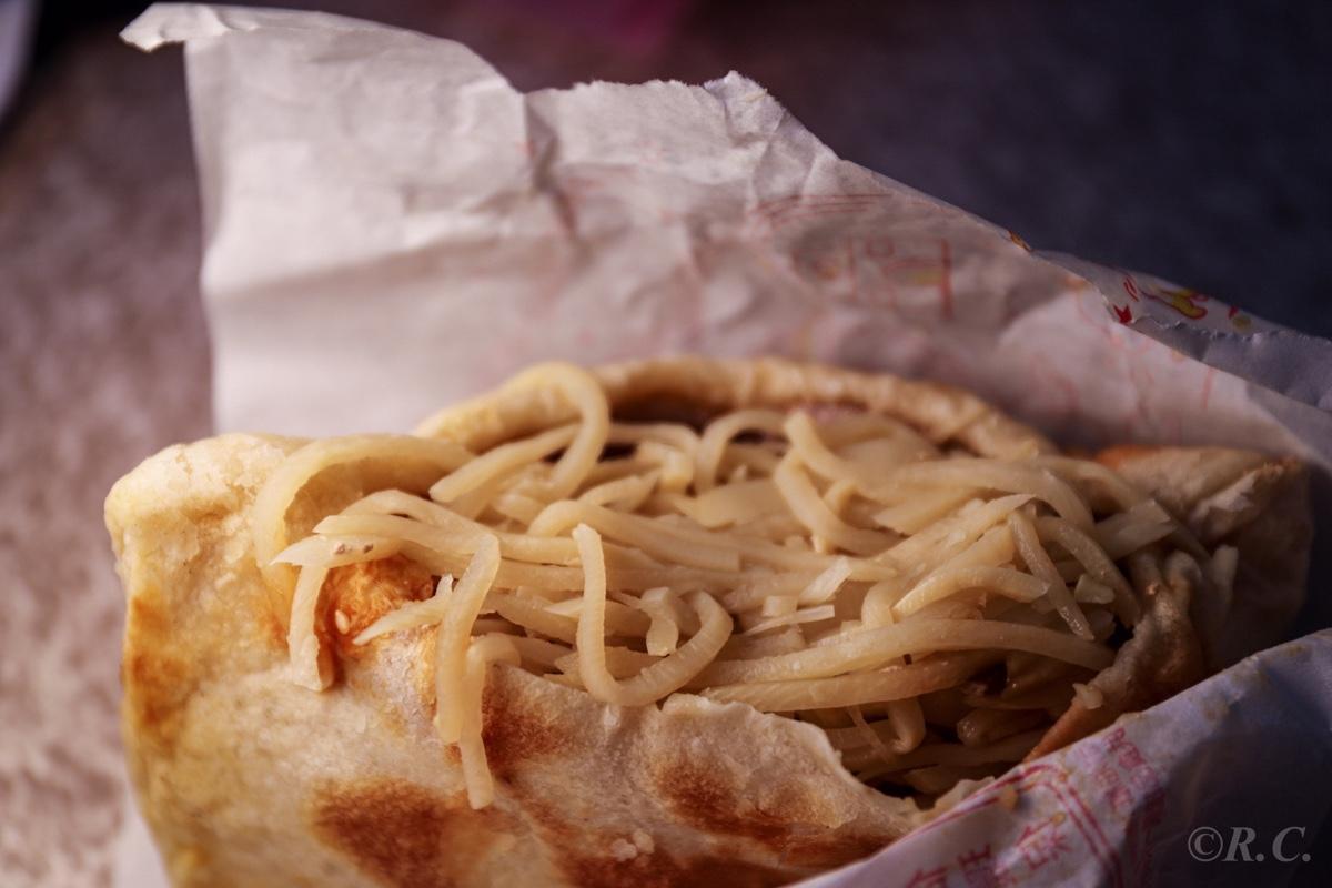 燒餅塞滿餡料,筍絲、豆乾、肉排、蛋⠀
