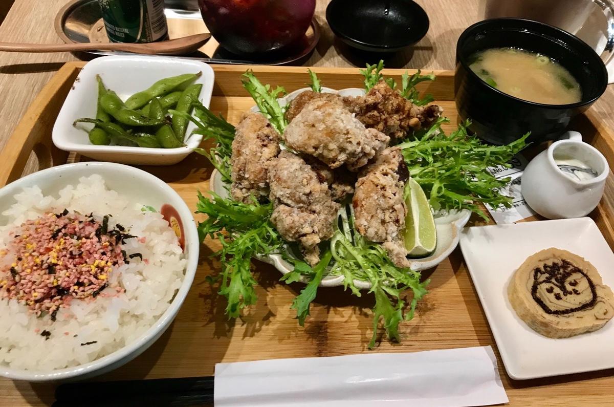 卡拉拉瀑布炸雞,炸雞裹著薄薄的粉,份量十足,肉都是大塊的,稍微太鹹,配上白飯就剛好,加上大理石紋路的醬料,玉子燒還印有logo。