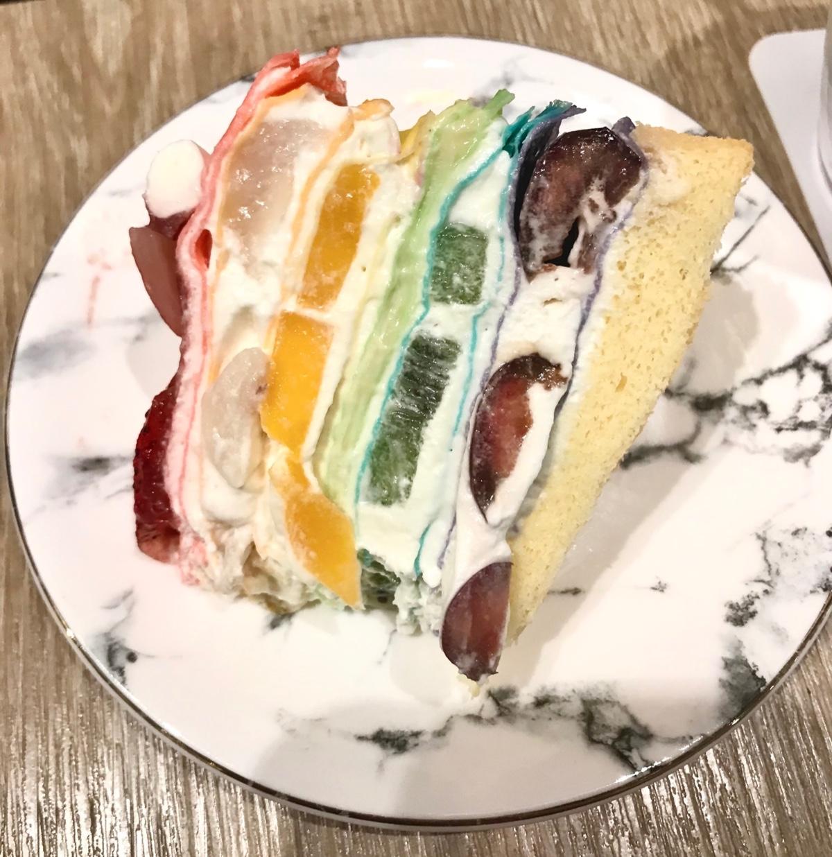 夢幻水果千層,夾了荔枝、櫻桃、芒果、奇異果以及草莓,沒注意是芒果,以為是水蜜桃,不小心誤食。