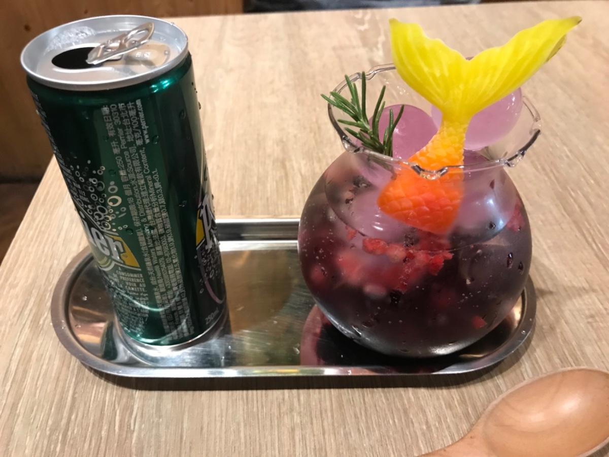 愛麗絲的異想世界,一個美人魚的尾巴,臨面而出,圓形冰塊,讓人以為是個裝飾品,搭配氣泡飲料,帶點莓果香氣,真是絕美讓人印象深刻。