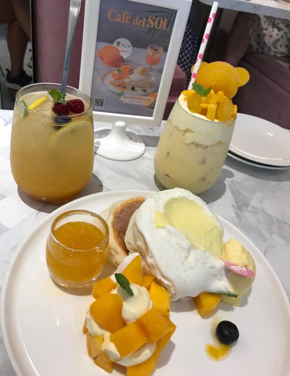 點了一杯菜單上沒有的隱藏菜單"🥭芒果熊熊雪酪"和一份季節限定的芒果季套餐組合附有一杯芒果柚柚泡泡和楊枝甘露舒芙蕾鬆餅🧇。