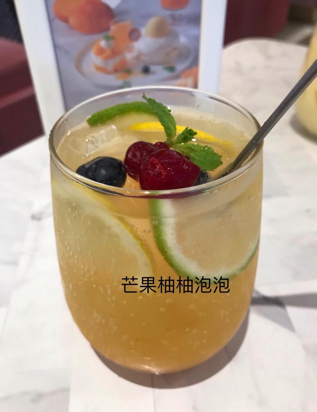 芒果柚柚泡泡就是芒果汁+汽泡水,我個人覺得還不錯,畢竟吃甜點還是要配不甜的飲料較合適。😋