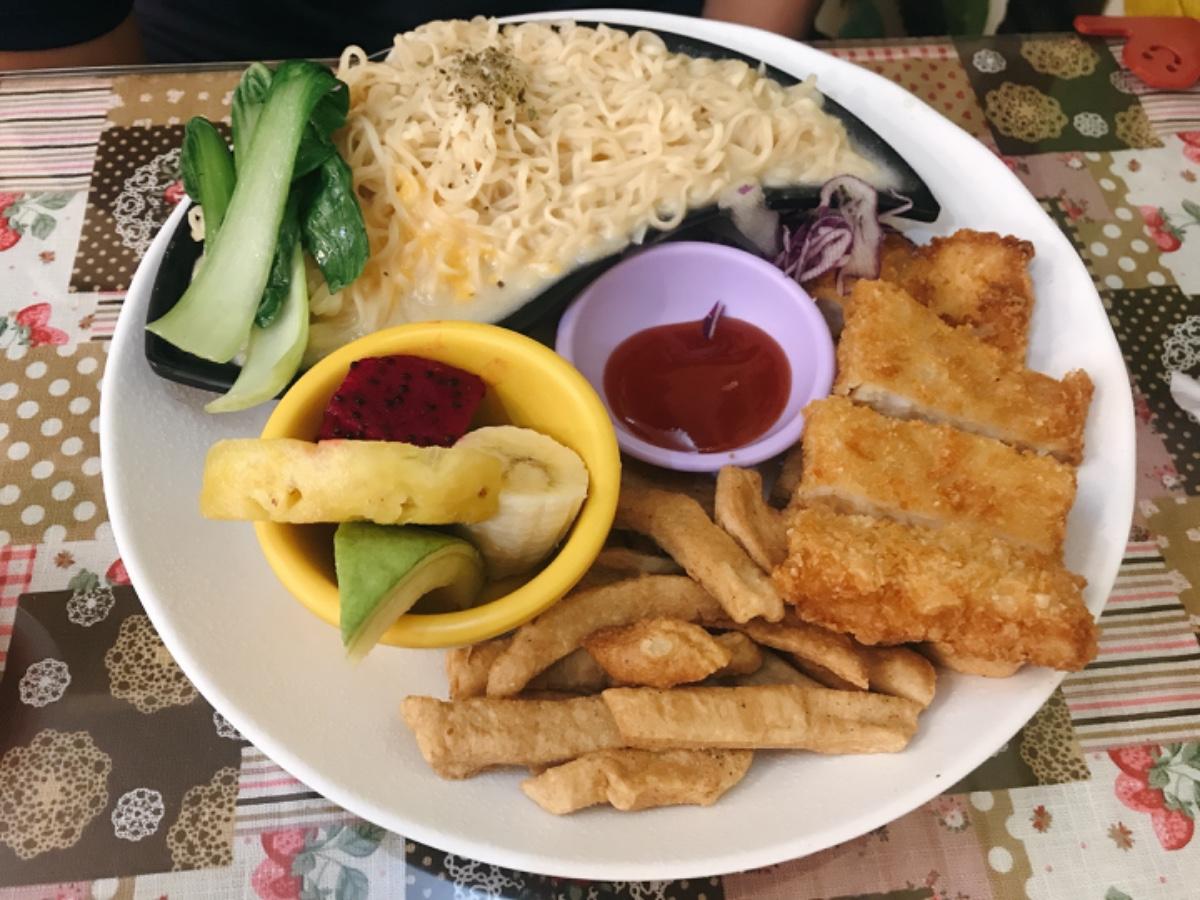 炒泡麵沒有太多的配料 不過醬汁很多也夠味 搭配的魚排 好吃耶!外面脆脆的 裡面魚很嫩耶~這個魚我ok🐟
