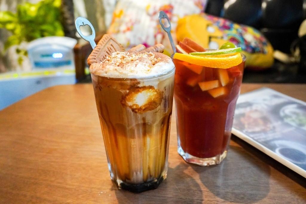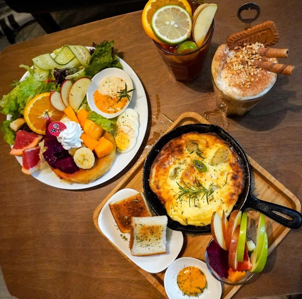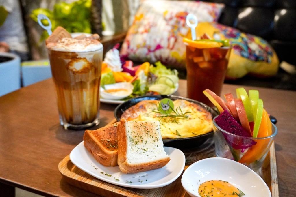 套餐內容非常豐富,有兩份主餐,分別是一份「圓舞曲鬆餅」,與一份「美味烘蛋」,還有一份當日口味的蛋糕(每日口味可能不同),兩杯150元的飲料,我們選了繽紛水果茶與沙灘排球咖啡。