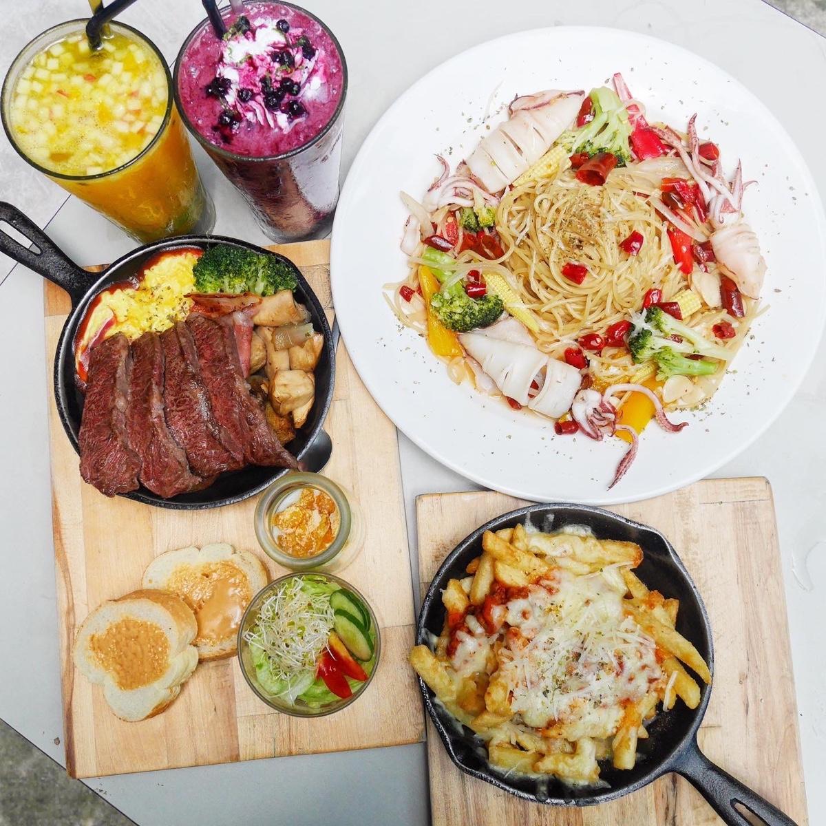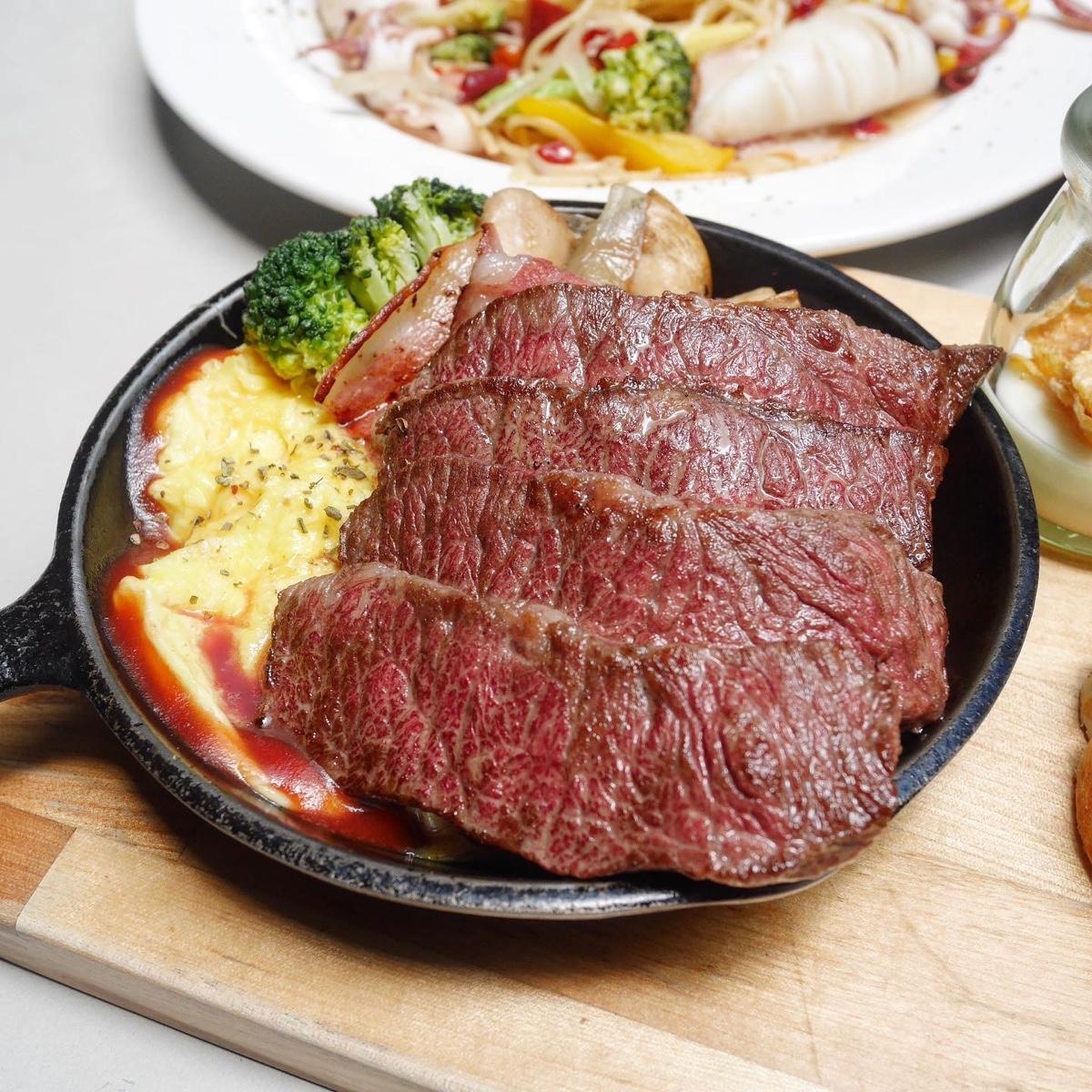 一早就吃牛排會不會太過份?更過分的是還足足放上了4大片😱加強版牛排拼盤絕對是他們家的招牌,夠暴力!夠震撼!鐵鍋裡有炒蛋、花椰菜、培根、杏鮑菇還有不少馬鈴薯塊!搭配花生醬法國麵包與沙拉優格和飲料,整份套餐吃起來很有飽足感!非常過癮☺️
