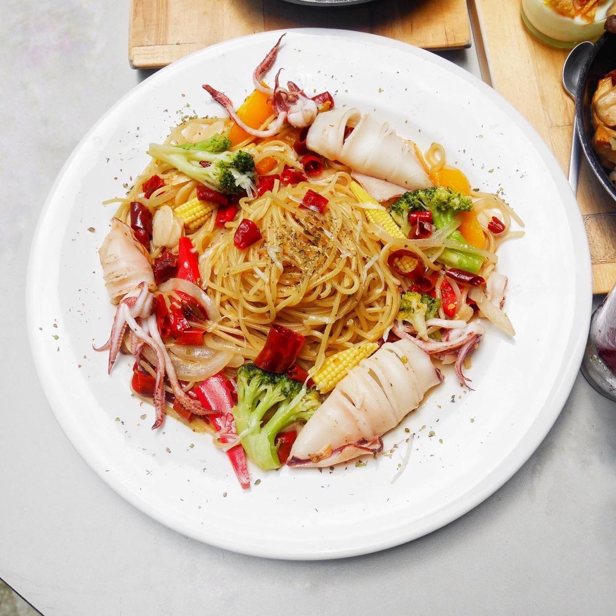 這道辣味香蒜墨魚麵,辣度真的很夠,義大利麵與乾辣椒、大蒜和各式蔬菜一同拌炒,看似清爽,入口卻是火辣帶著蒜頭的香氣!超級過癮🤤附上三尾小墨魚都蠻新鮮的,肉質有彈性卻一點也不難咀嚼👍🏻