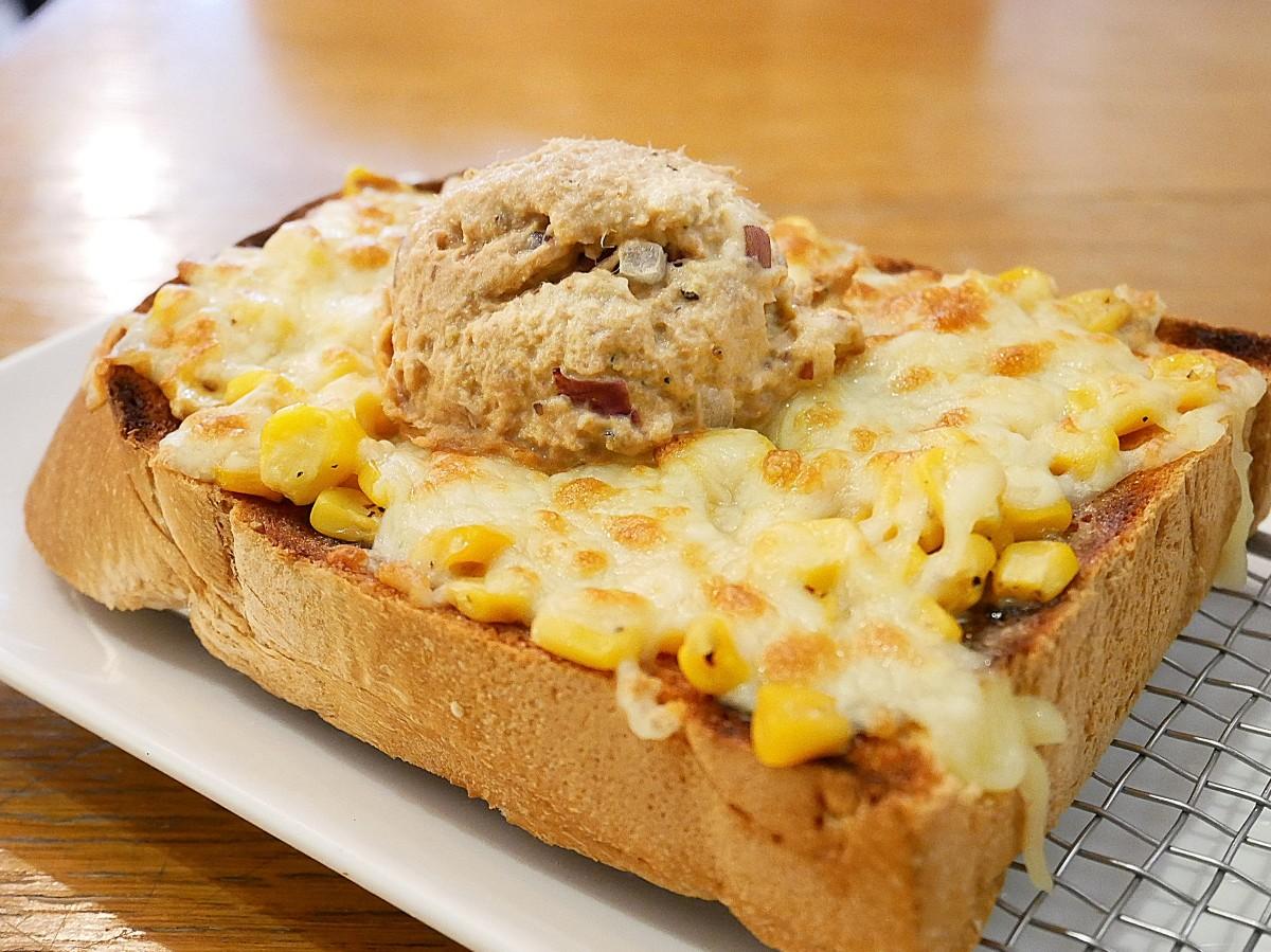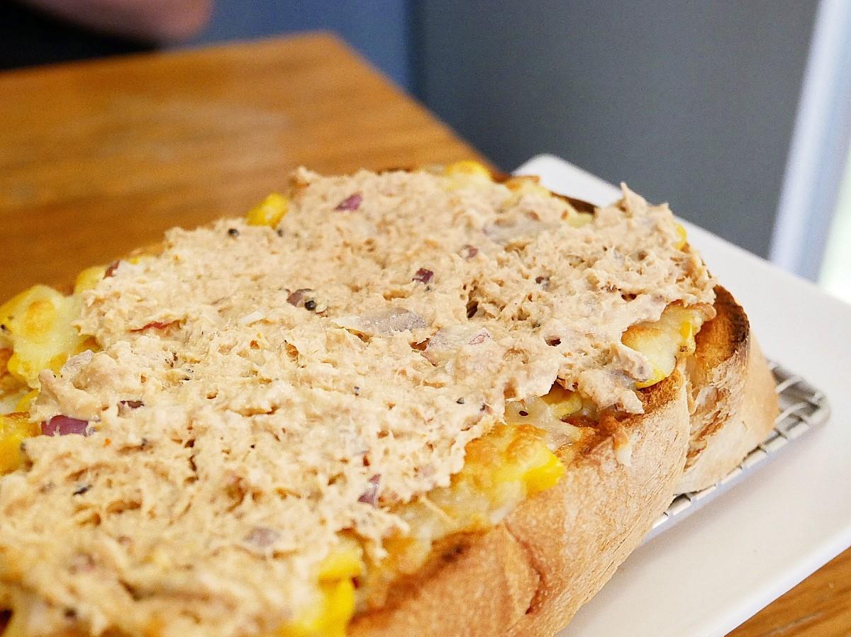 這款吐司鋪了一層焗烤玉米,最上頭再挖一球鮪魚沙拉擺上去,看起來很吸睛
