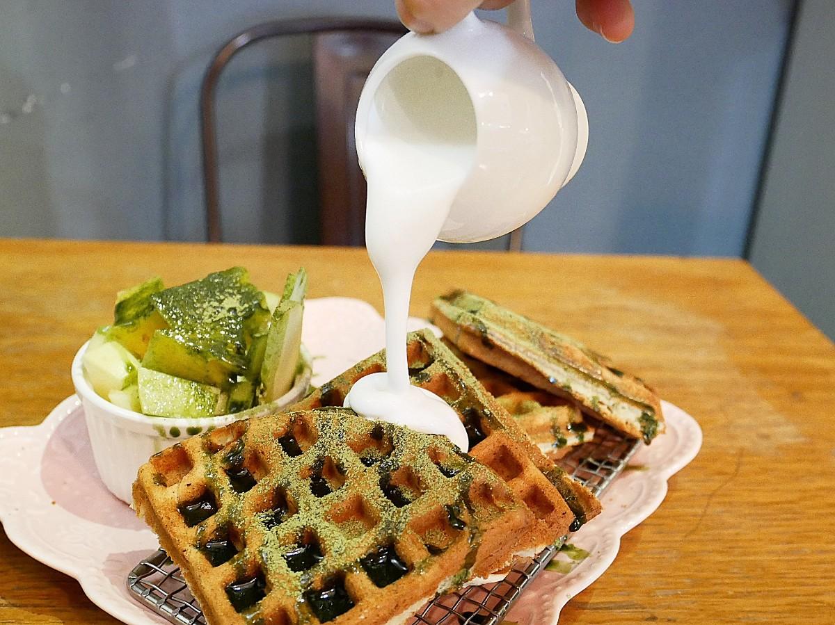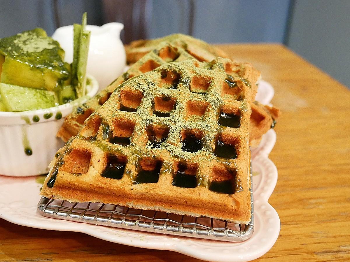 鬆餅上桌時,綠油油的抹茶醬已經淋上去,旁邊還會副一份抹茶水果冰淇淋和奶蓋