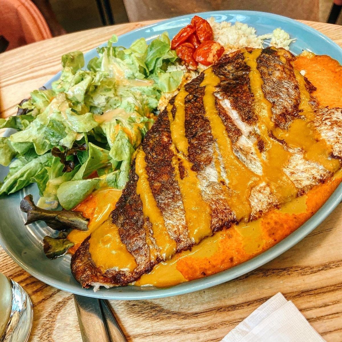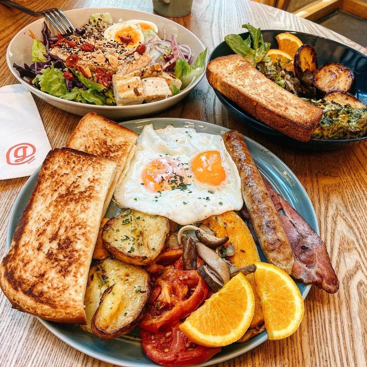 ▪️招牌早午餐的吐司🍞烤的剛剛好把不熟蛋放在上面很有飽足感,馬鈴薯🥔烤的很香有焗烤香味,還有香腸跟培根🥓超飽的一份;鱸魚沙拉搭配的醬很像印度香料料理很香,鱸魚🐟很大一份