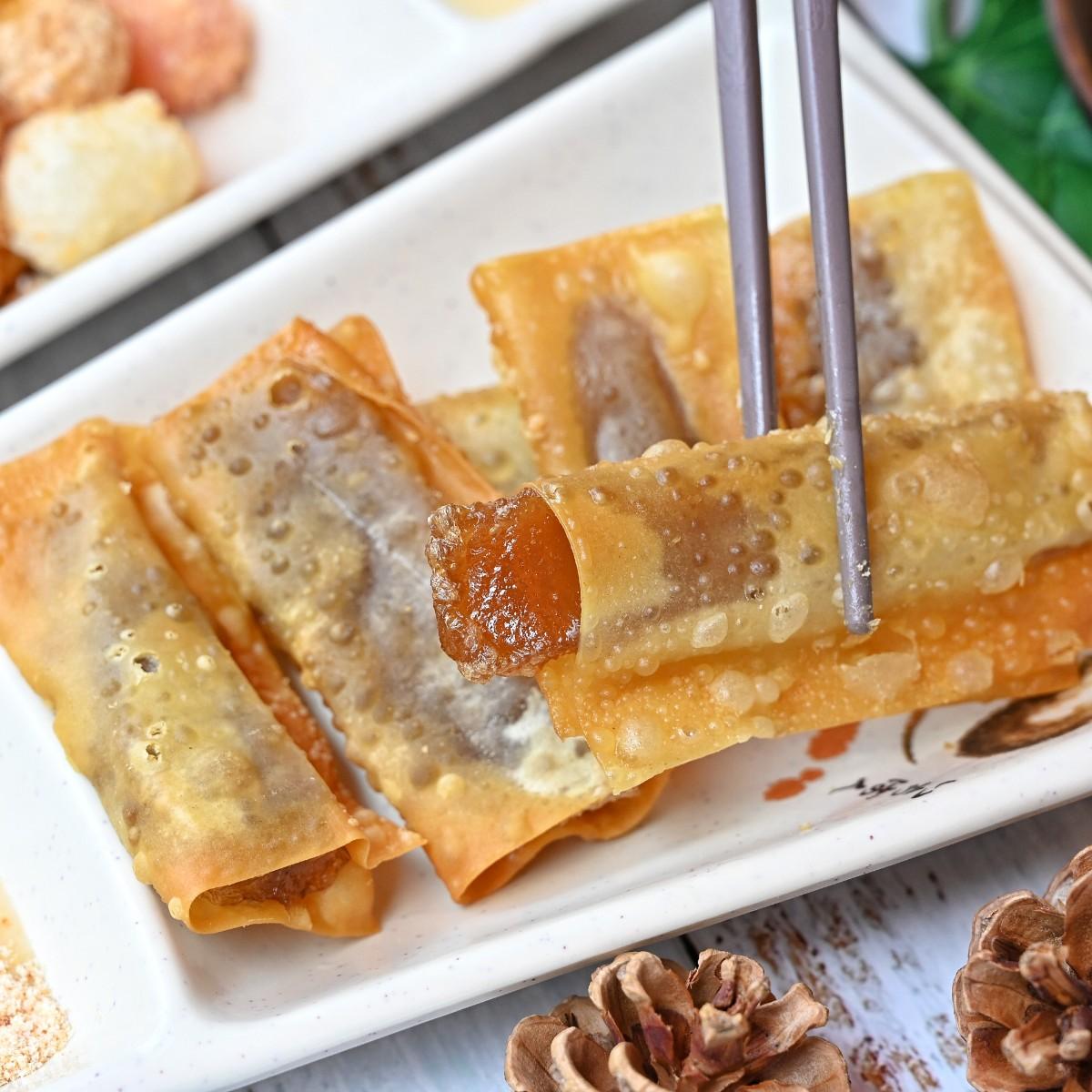炸年糕外皮炸的超酥脆,咬下去還會發出清脆的卡滋聲,裡頭的年糕超Q軟,吃起來帶有淡淡的甜味,一旁附上煉乳及花生粉,甜甜的滋味