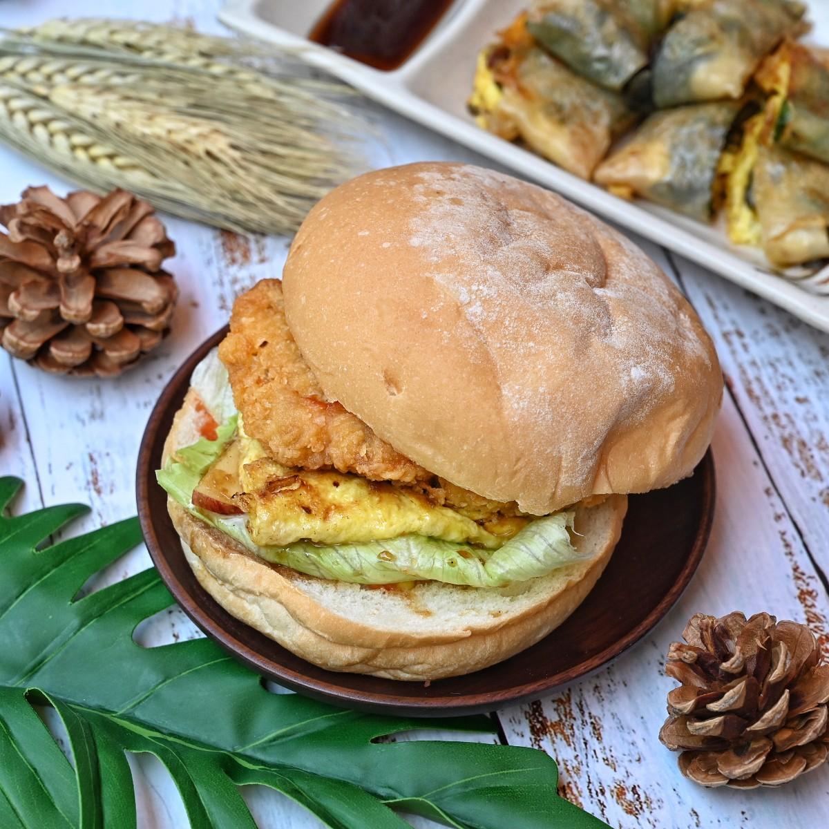 採用穀堡,跟一般早餐店的漢堡不一樣,外皮烤至外脆內Q,有一點像法國麵包的口感,中間搭配大塊的炸雞腿排,搭配生菜、蛋、蘋果、塔塔醬及墨西哥醬,口感酥脆,帶著微辣風味,層次超豐富