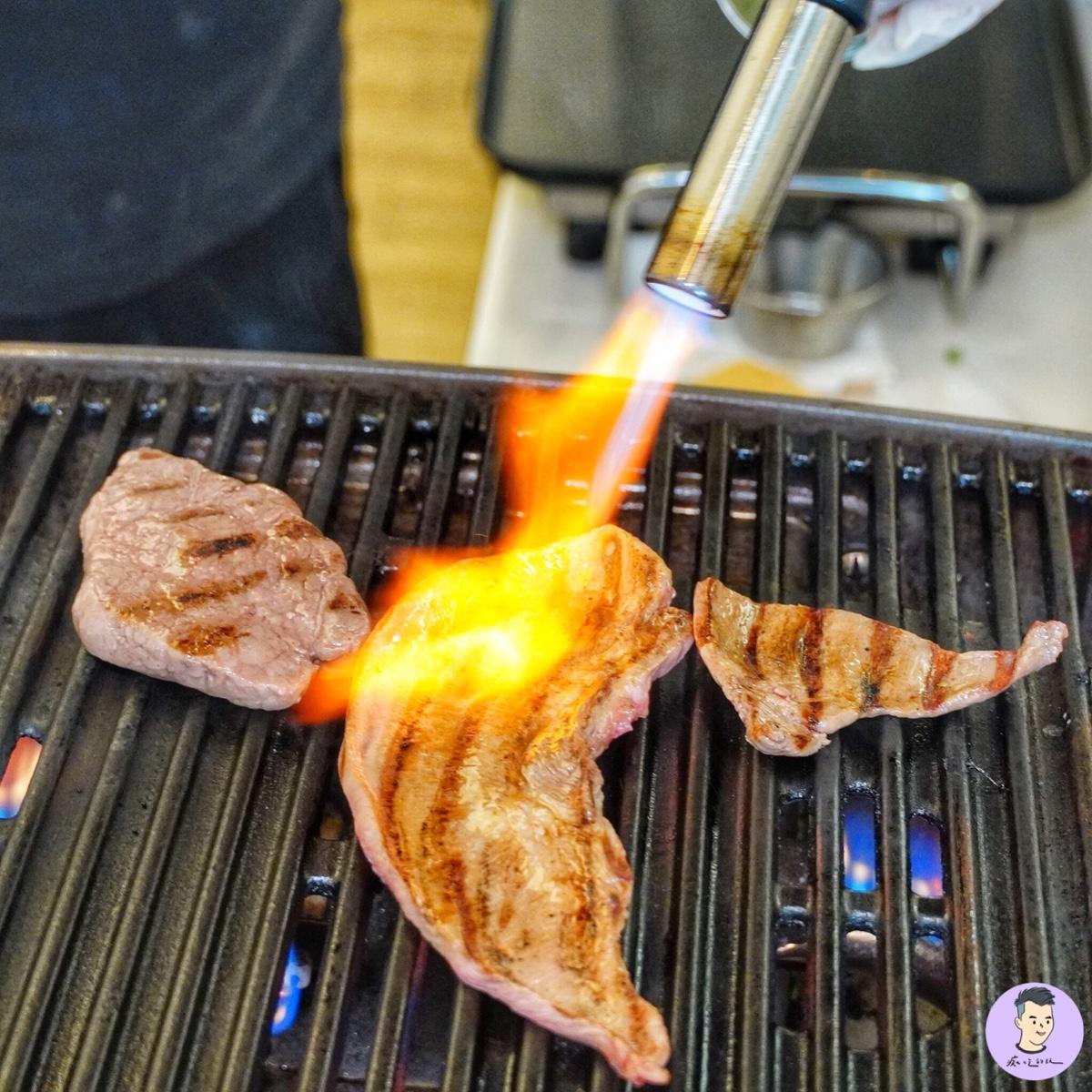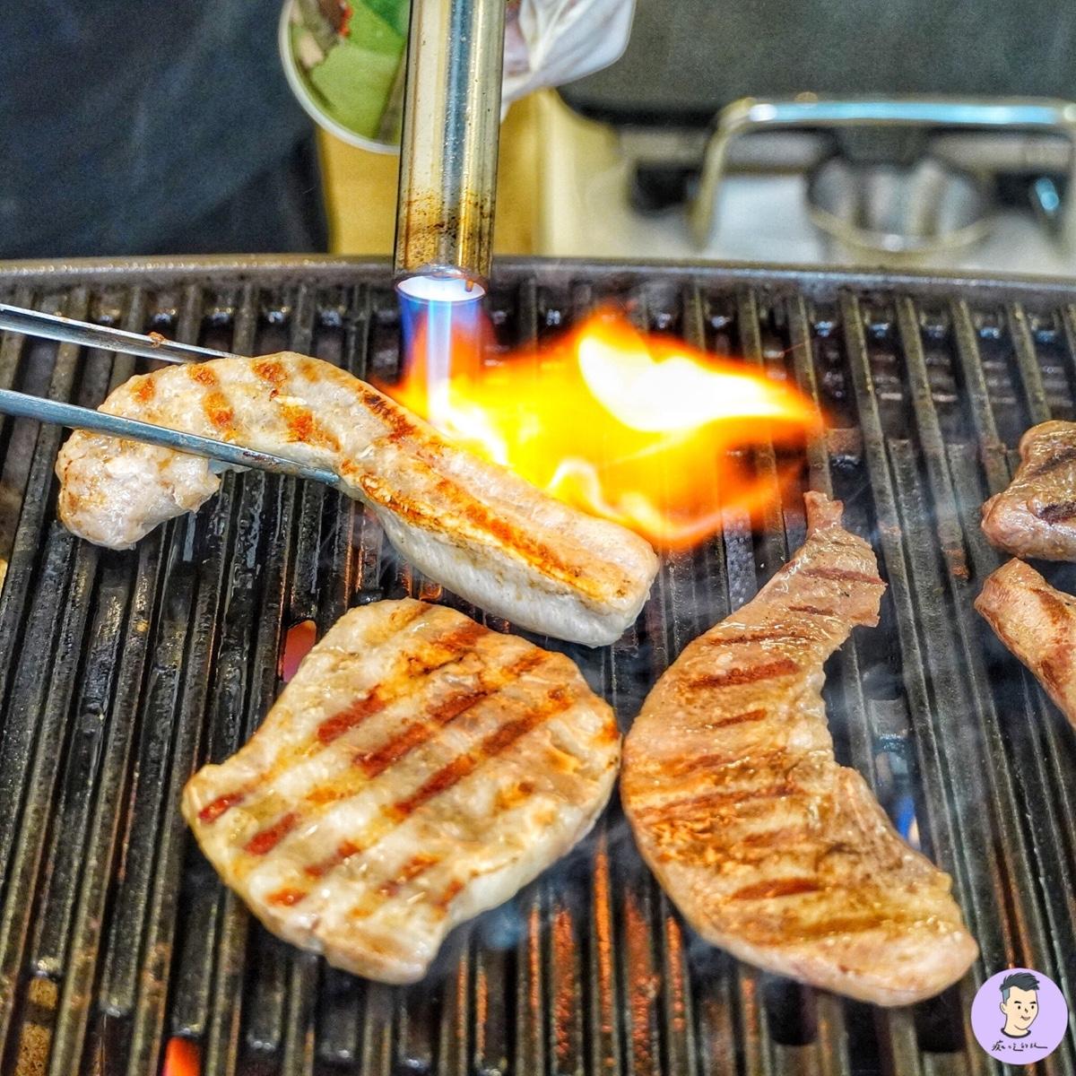 烤至粉嫩色澤 肉質嚼勁很有肉汁 配料可免費加
