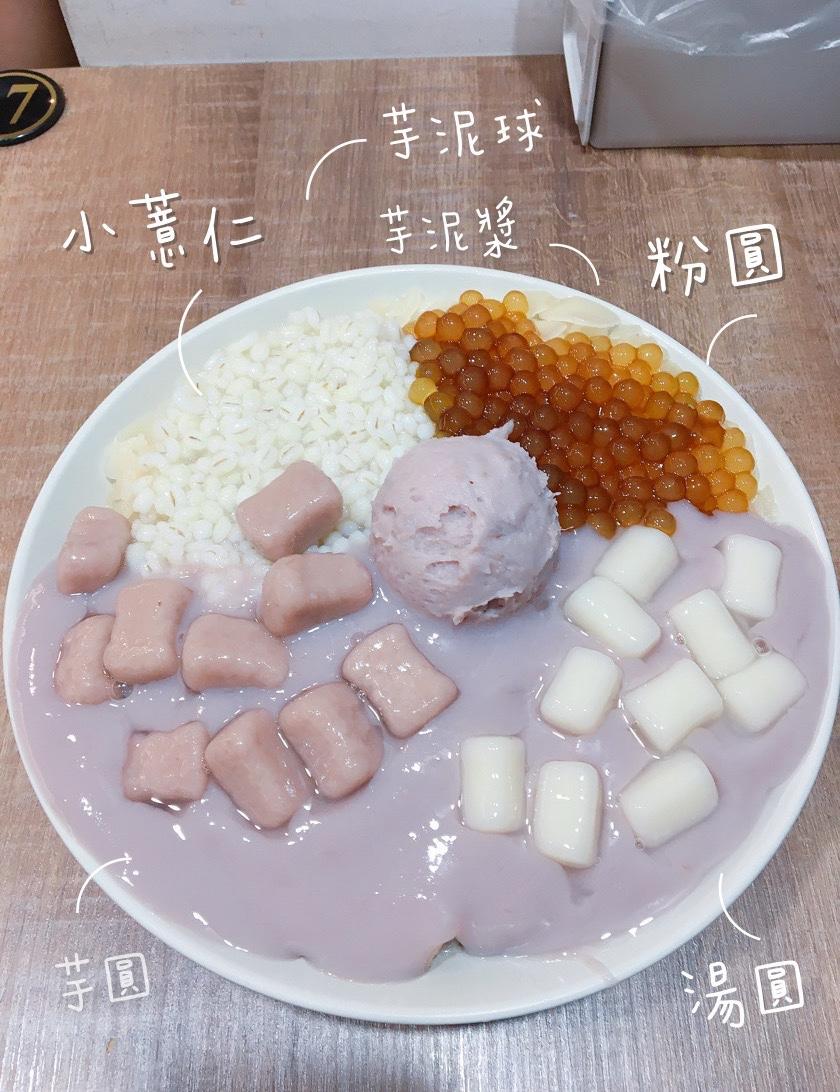 超大一盤!這兩人吃都沒問題!光看配料就有芋圓、粉圓、芋球、芋泥漿、小薏仁、湯圓,都是受歡迎的配料,基底冰是一片片的蔗片冰,十分好入口,個人很愛綿密的芋泥球,不甜吃完又有飽足感,小薏仁咬起來口感脆脆的很好吃!其他甜品請參考圖7的價格表哦~