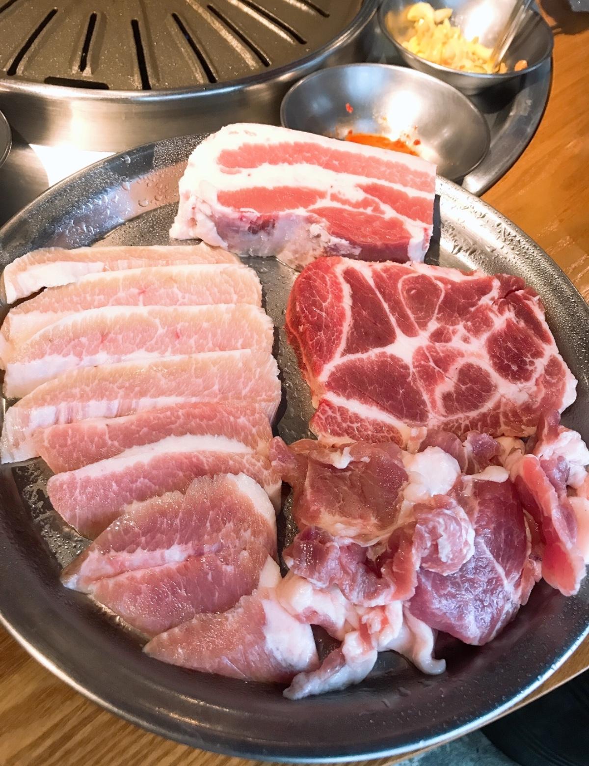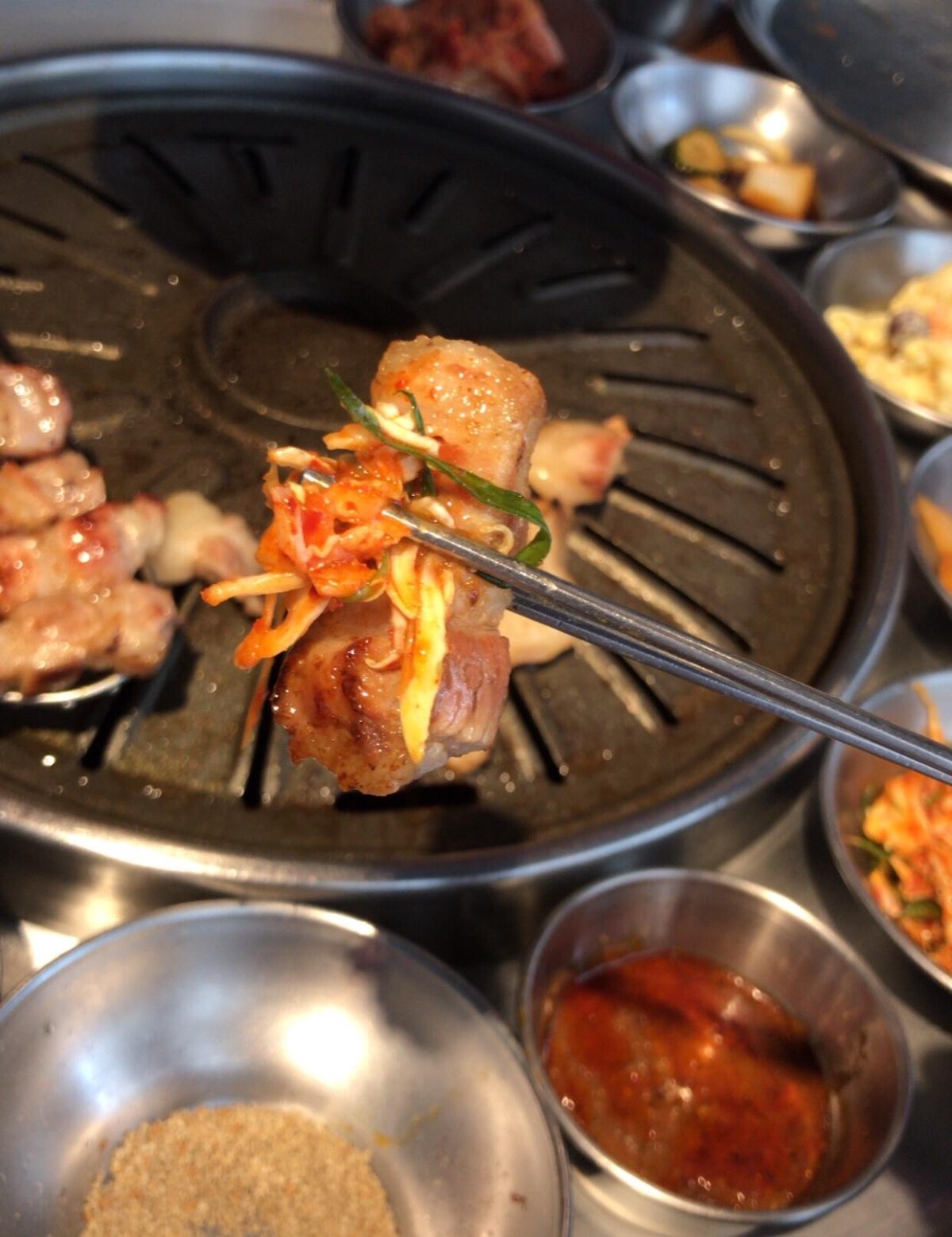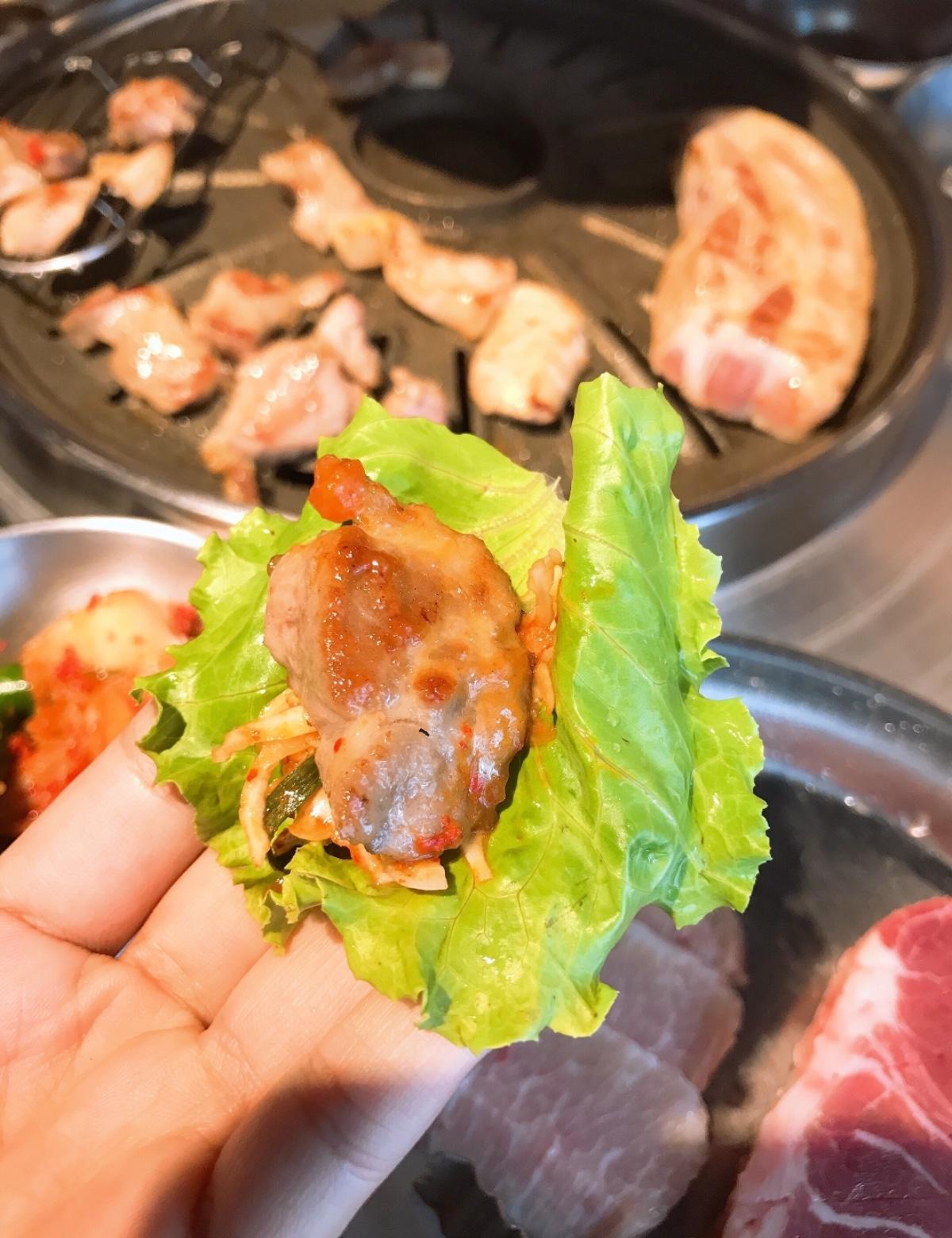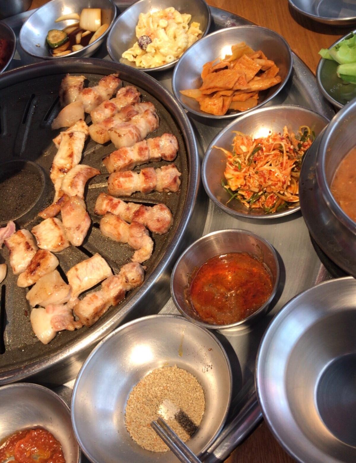 韓式烤肉真的必點豬五花!!烤到又脆又香 再跟小菜一起吃