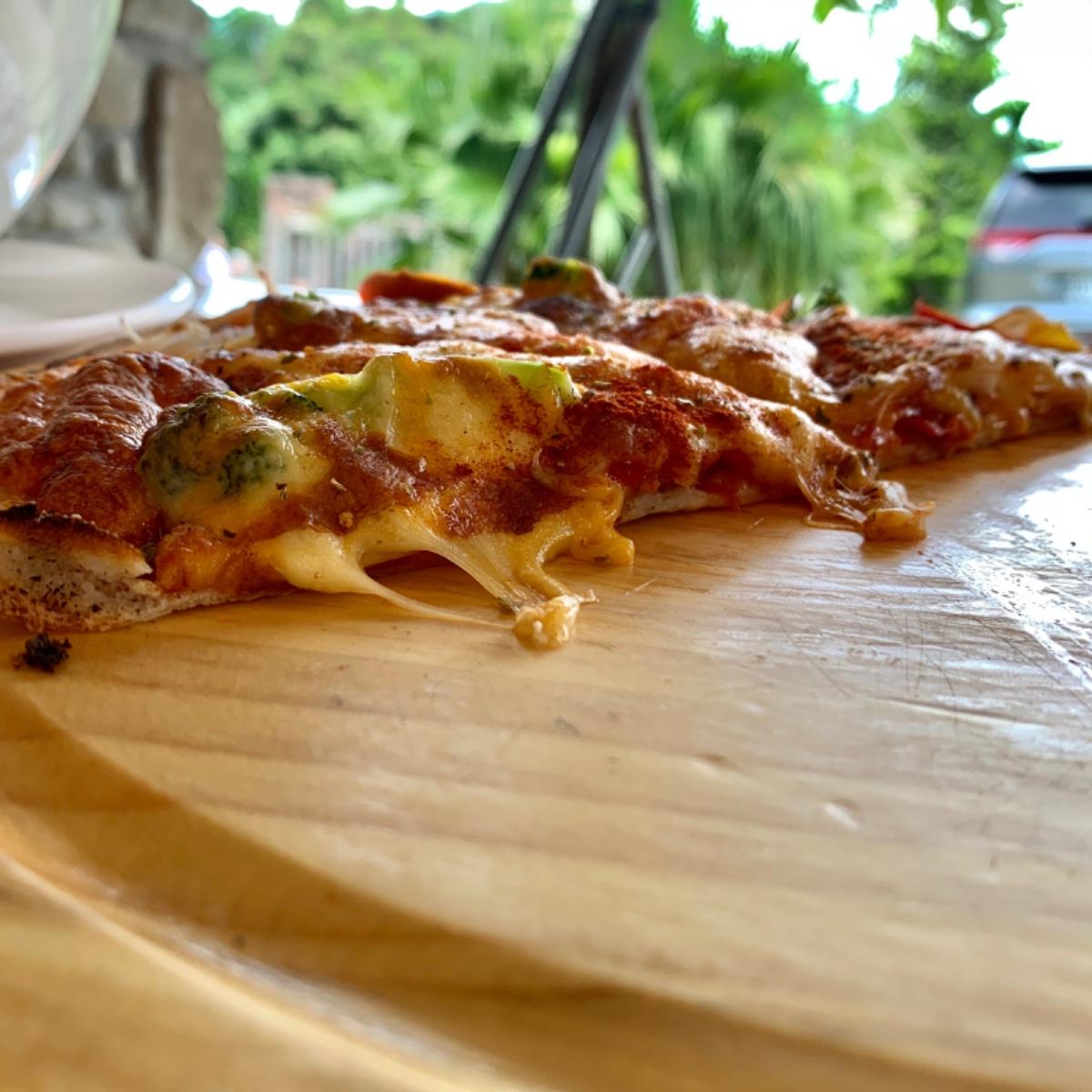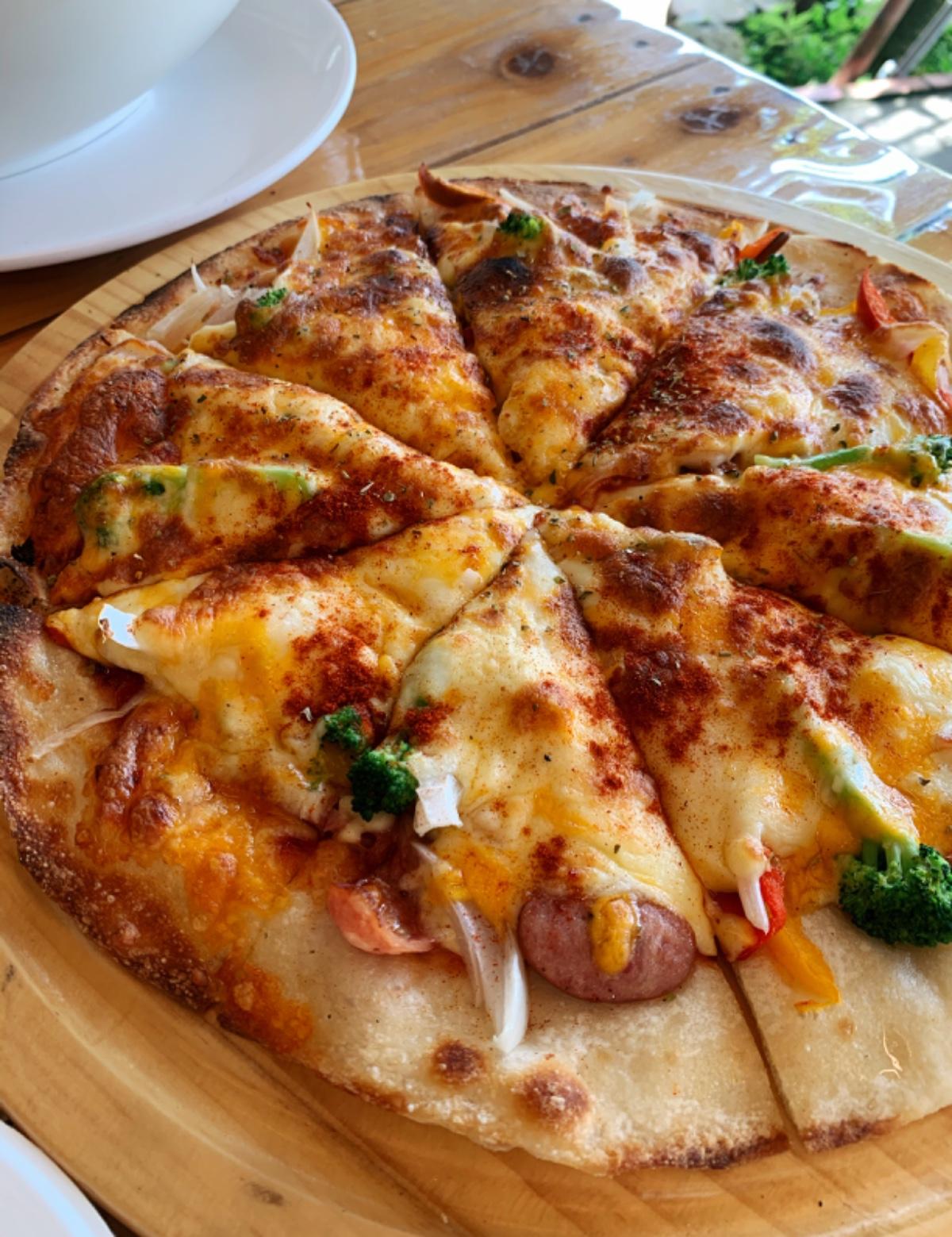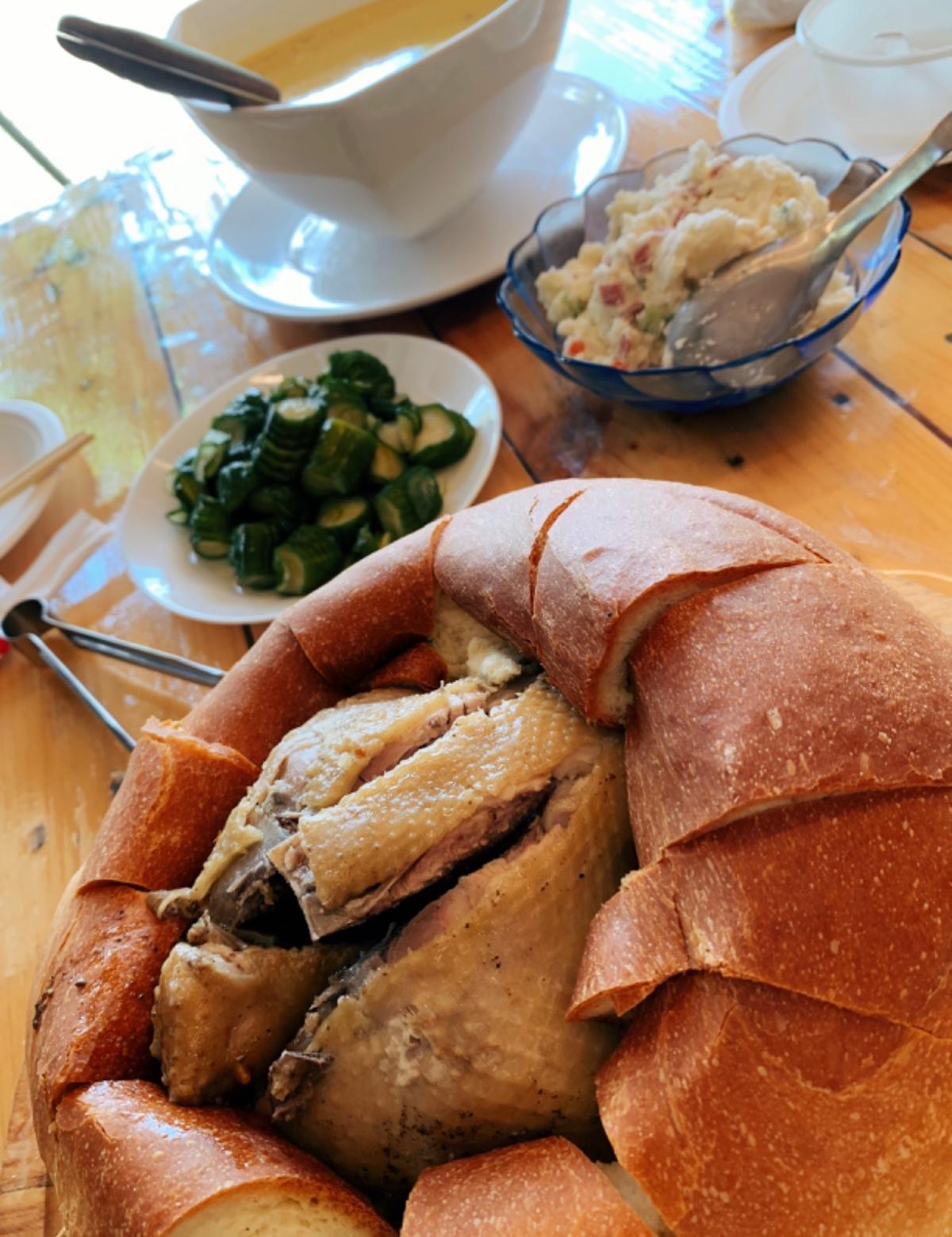 把整隻雞包進麵包窯烤的麵包雞真的很酷,上桌時店家會先幫你剪個開口,剩下的由自己去處理,雞肉有胡椒辛香料調味過,吃起來味道剛好,可以麵包夾著雞肉或是把麵包泡進濃湯吃都別有一番風味,披薩大塊又有濃厚起司牽絲,小黃瓜的酸甜和沙拉的清爽剛好可以中和掉整體的油膩感