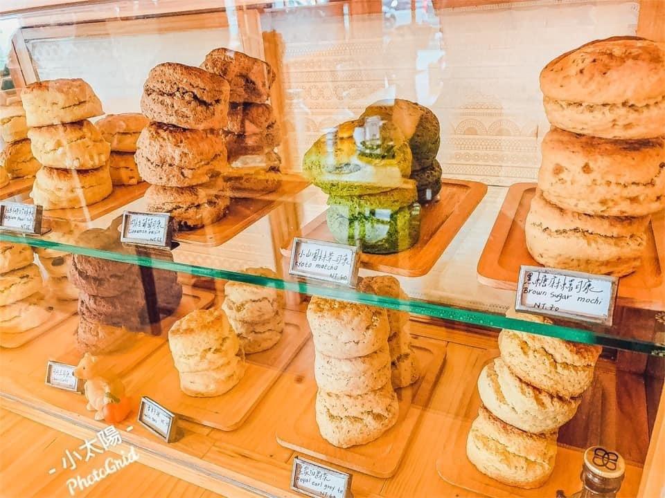 主打司康,口味多元,除了當餐點,也能外帶當作小點食用。目前有十種口味可供挑選。一整排司康口味讓人看得目不暇給。