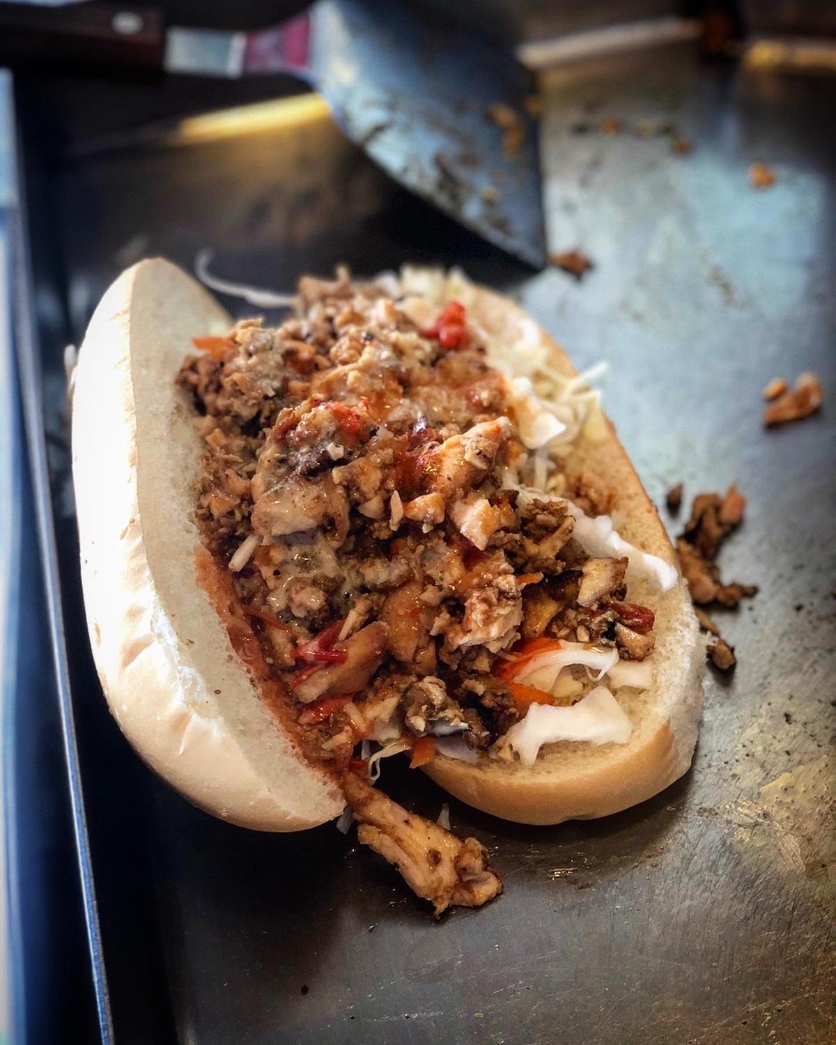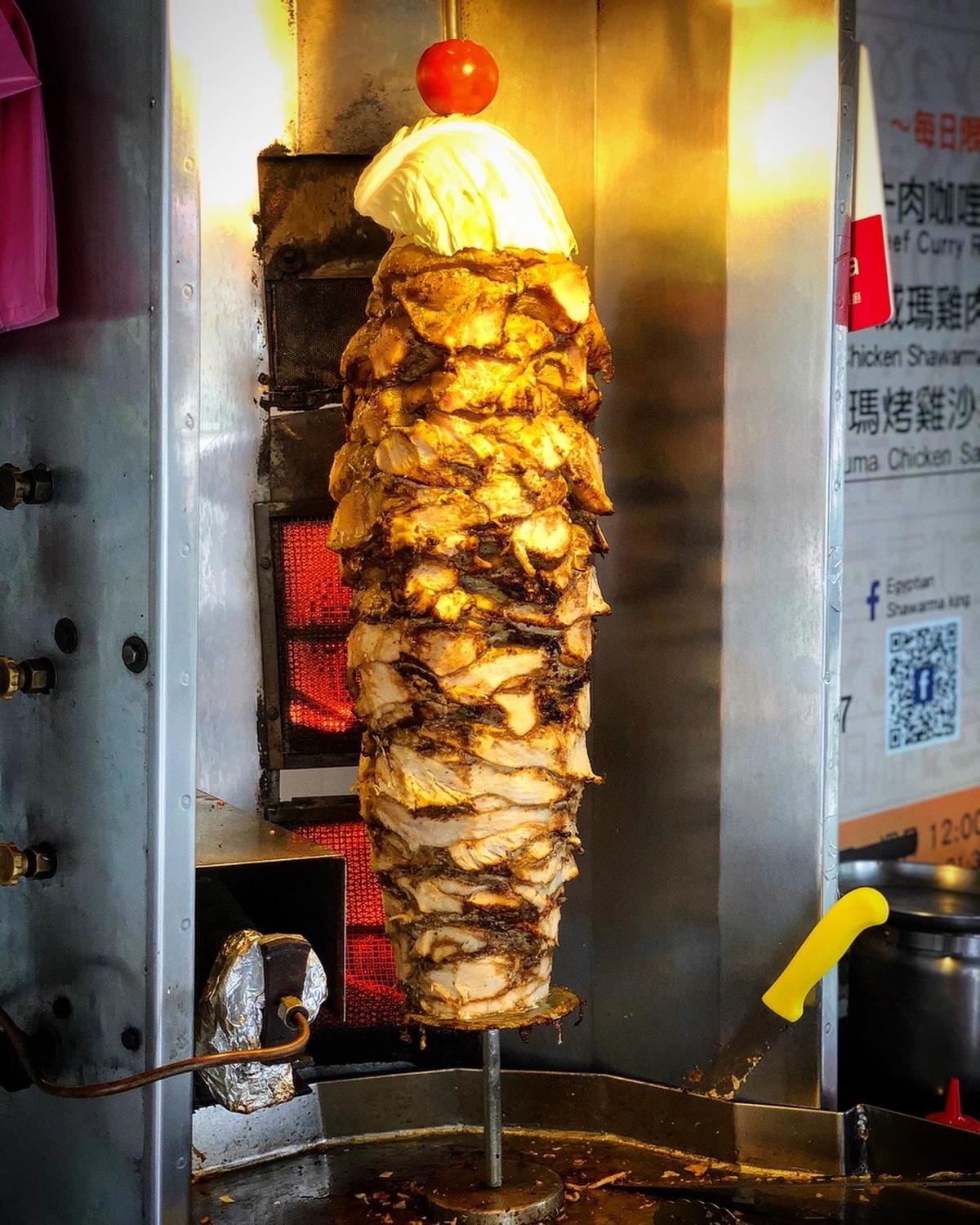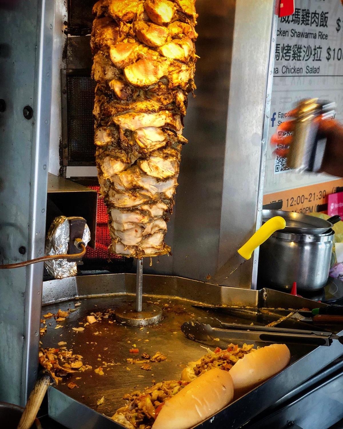 滿滿的雞肉串在烤爐上,主廚一點一點的切下來,配上洋蔥蕃茄還有肉滴下來的肉汁及油脂下去拌炒,夾進麵包裡,在經過爐子旁邊加熱一下讓麵包烤一下,雞肉的部分經過孜然還有優格等醃漬過後味道十足且不柴,配上洋蔥蕃茄帶出來的甜味,在淋上特製醬汁,喜歡吃辣的朋友可以加些辣更夠味,大份的份量飽足感不輸便當,可以說是正餐好選擇