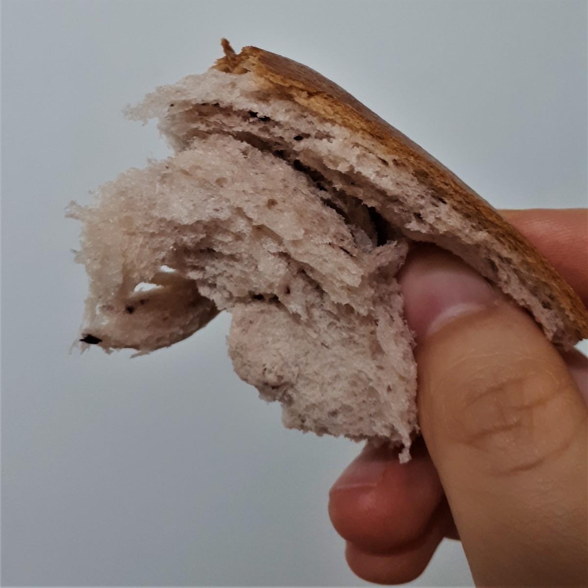 香氣沒其他突出,淡淡的香氣,裡面沒有包料,是把藍莓跟麵團混在一起製作的,一樣Q彈,撕下一塊看起來有點像吐司