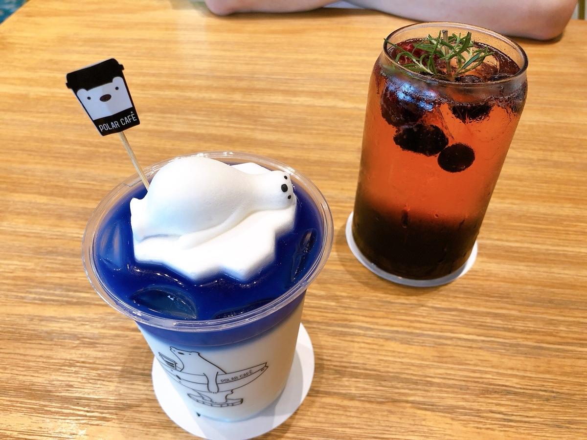 為了要有北極熊漂浮在海上的感覺特別點了蝶豆花牛奶再加上80元的北極熊棉花糖(好貴啊)喝起來就是牛奶的味道😅但是造型非常可愛。另一杯是葡萄莓果氣泡飲,酸酸甜甜的還不錯👍