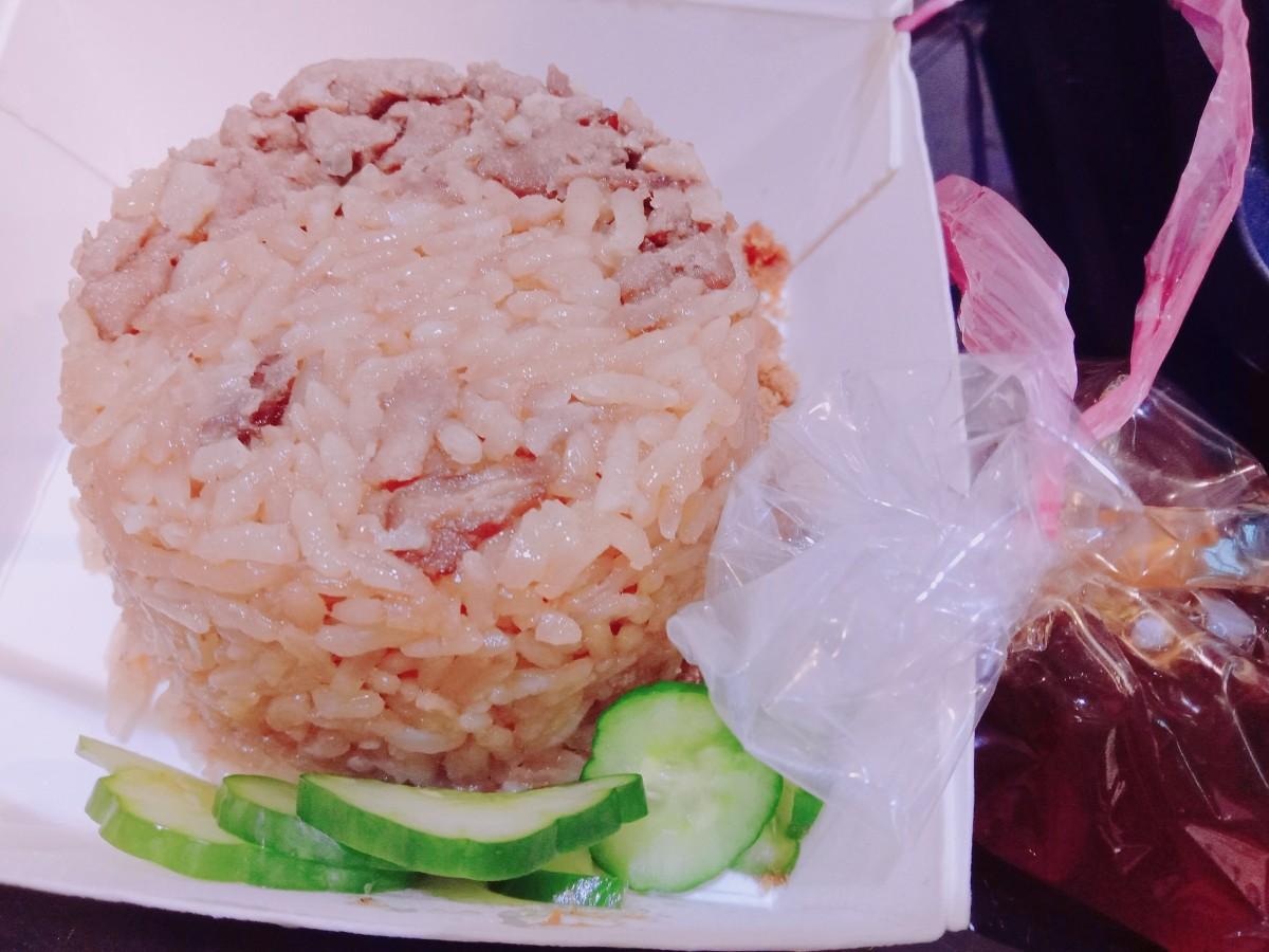 米糕討喜的部分在於:分量不多,咖啡色的糯米粒粒分明參雜著肉燥,旁邊放著清脆的小黃瓜,也很有飽足感,同時米糕有了小黃瓜也去了油膩,一口米糕一口鹽水雞,讓人欲罷不能。