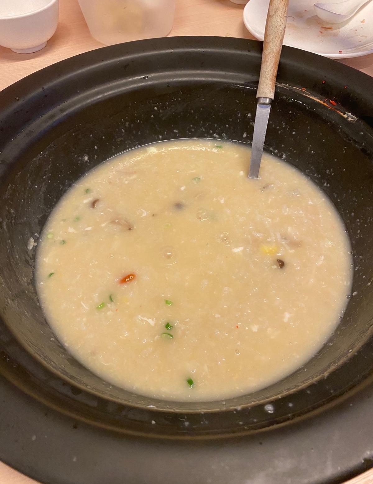 最後會集海鮮大成成為海鮮粥,會加上蔥跟蛋,並備有胡椒鹽跟菜脯,當然也可以選擇加或不加。