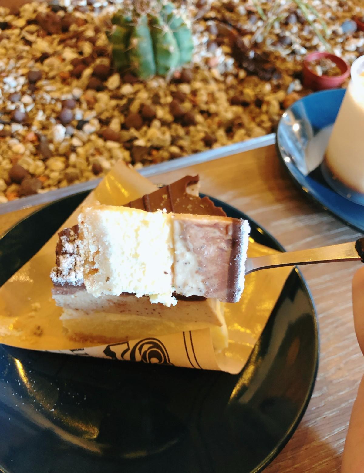 再來是小邊也覺得很厲害的甜點,吃起來非常有層次感的伯爵雙層乳酪,由上到下應該是巧克力、伯爵慕斯、乳酪蛋糕、餅乾,吃一口,首先出現的是伯爵的香氣,再來是濃郁乳酪的味道,最後是餅乾以及微苦巧克力的香氣作結,伯爵慕斯的口感比較接近奶凍的口感QQ的,乳酪蛋糕口感札實,巧克力和餅乾增添了酥脆的口感,一個蛋糕卻有多種口感及味道,而且完全無違和感,也一點都不會讓人覺得甜膩ლ(・ω・ლ)