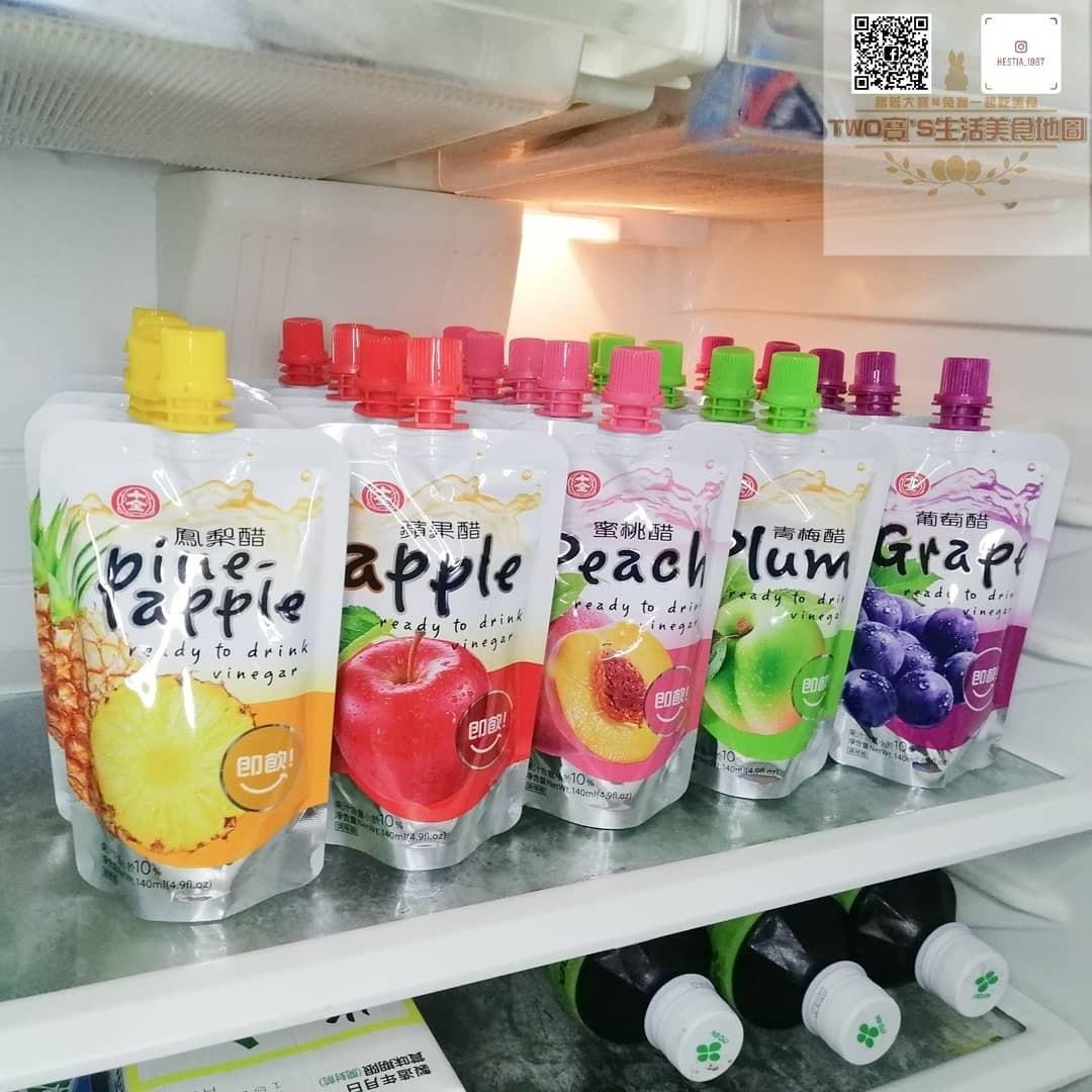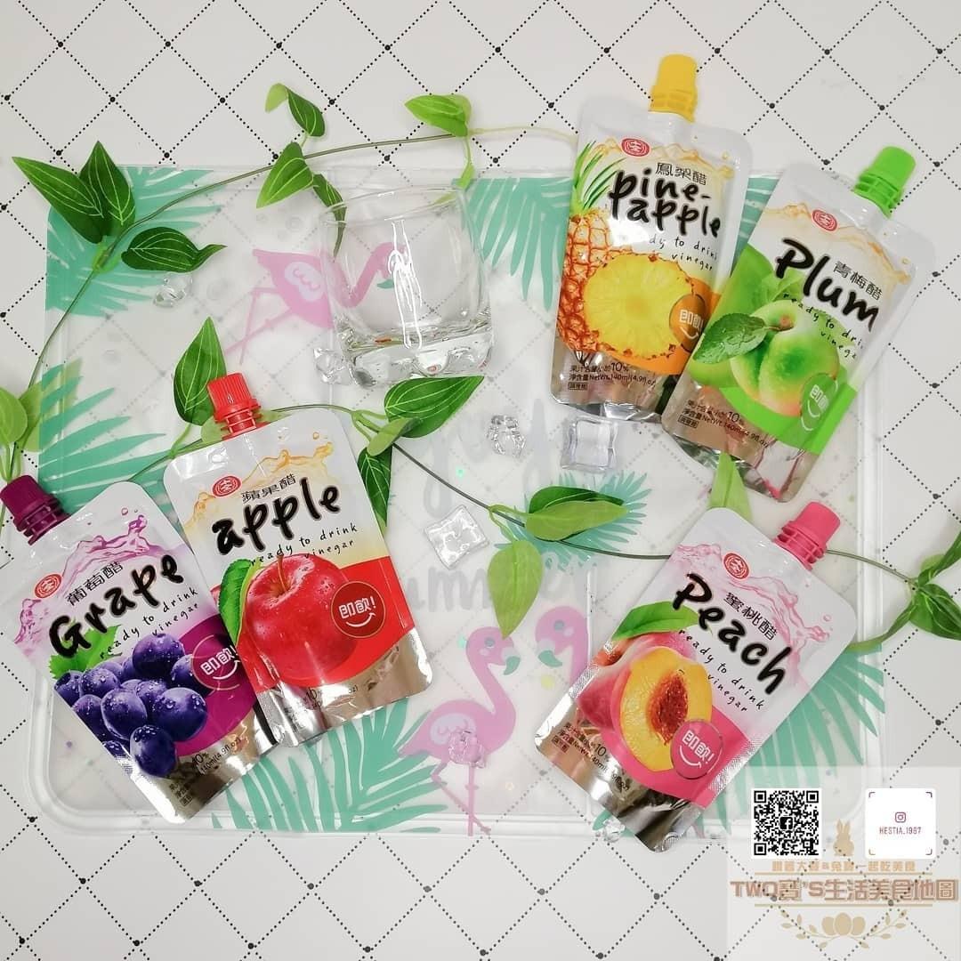 總共有五種口味~青梅、蘋果、水蜜桃、鳳梨及葡萄,都是使用糯米經長時間釀造,形成芳香提味的釀造醋,加入台灣天然果汁釀製而成,每種味道都很溫和,不需要加水稀釋。(小提醒,喝之前要搖一下,讓醋和果汁混合更好喝喔)