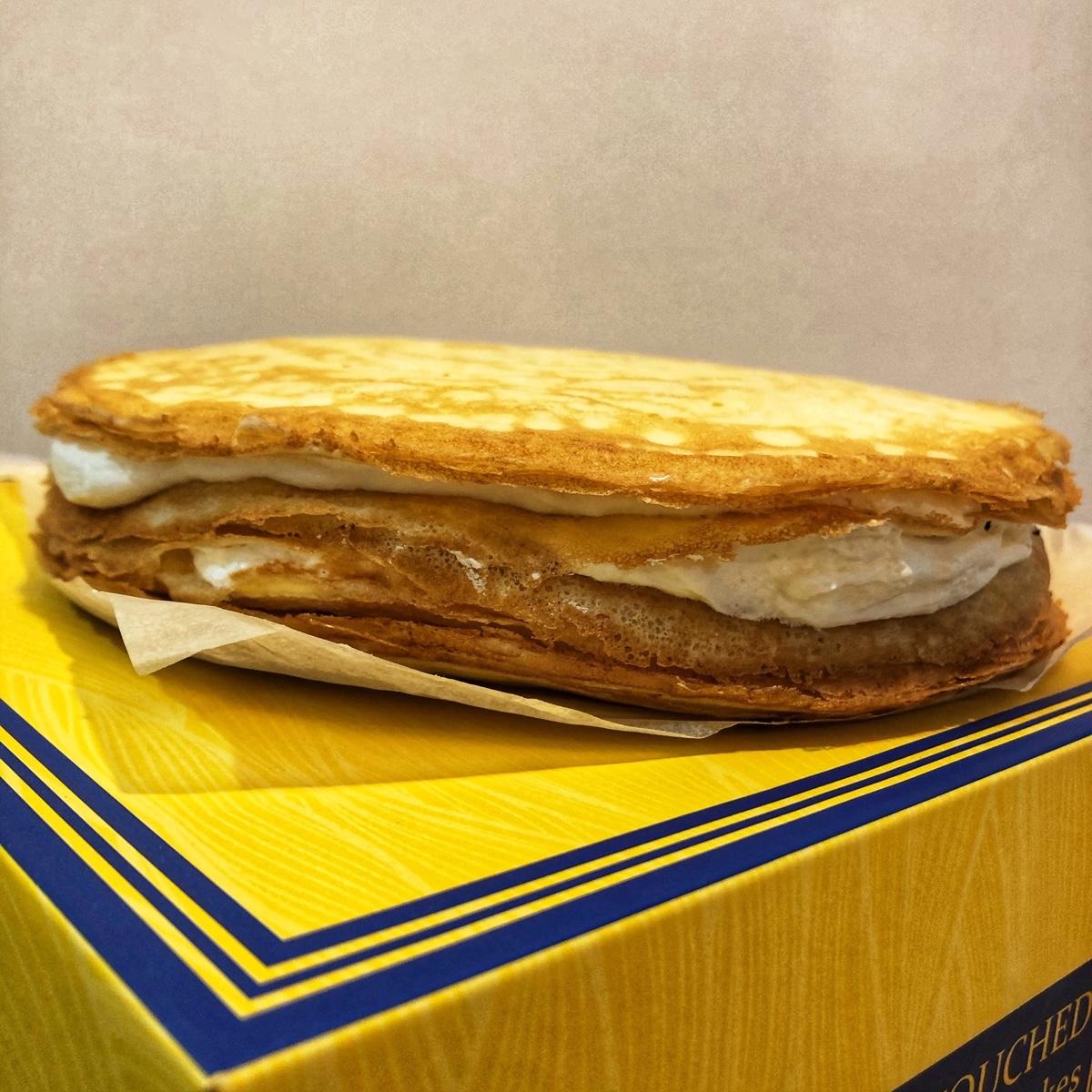 立即從冷凍庫取出食用與放置30分鐘後食用,兩者風味大不同。前者較為像冰淇淋,冰涼透心消暑。放置一段時間後,可品嘗到有法式可麗餅口感,軟嫩充滿小麥的千層餅皮 ,層層堆疊口感也較為顯著,兩者搭配美式咖啡都相當合拍,讓原本殘留在口中的奶香味與苦澀美式咖啡結合,完美無暇。