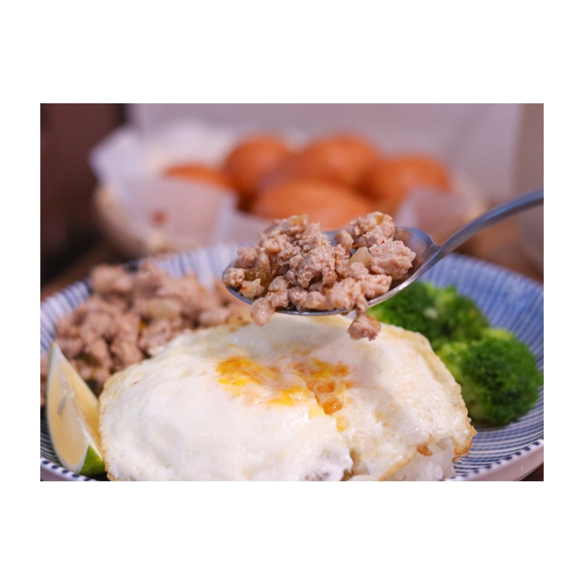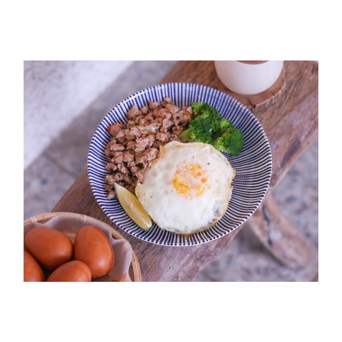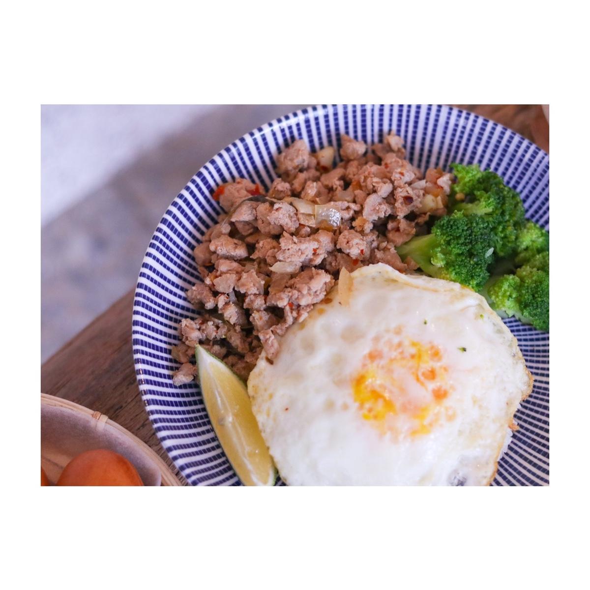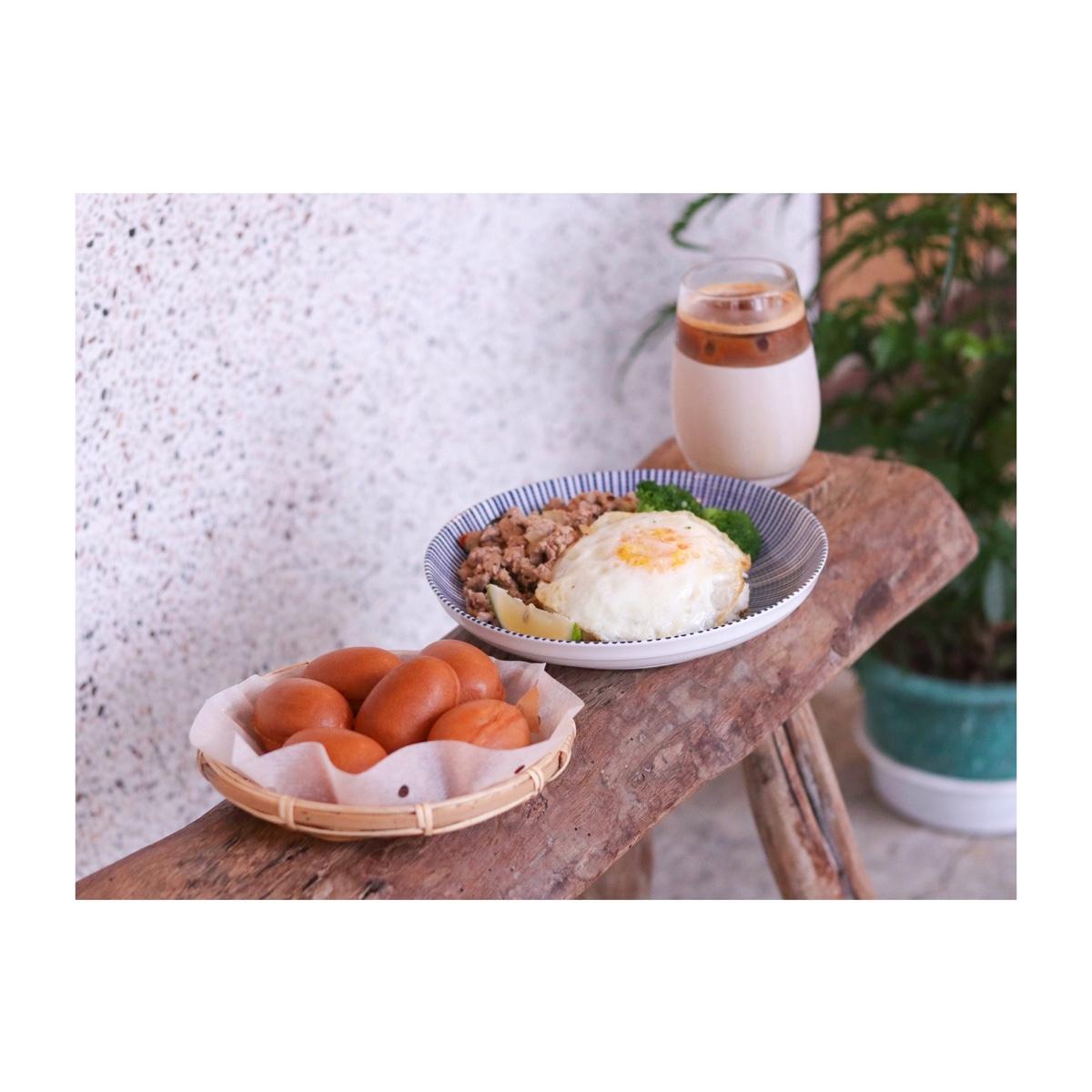 看似清淡的打拋豬肉飯,是將瘦絞肉以獨特辣醬拌炒,吃來其實香辣開胃,雖然感覺並非傳統泰式口味,但還是很好吃,一旁附上的青花菜與荷包蛋,也讓整體營養更為均衡,是道非常家常也溫馨的料理,店裡還有幾樣正餐選項,對於想去咖啡廳享用鹹食的人來說非常方便!