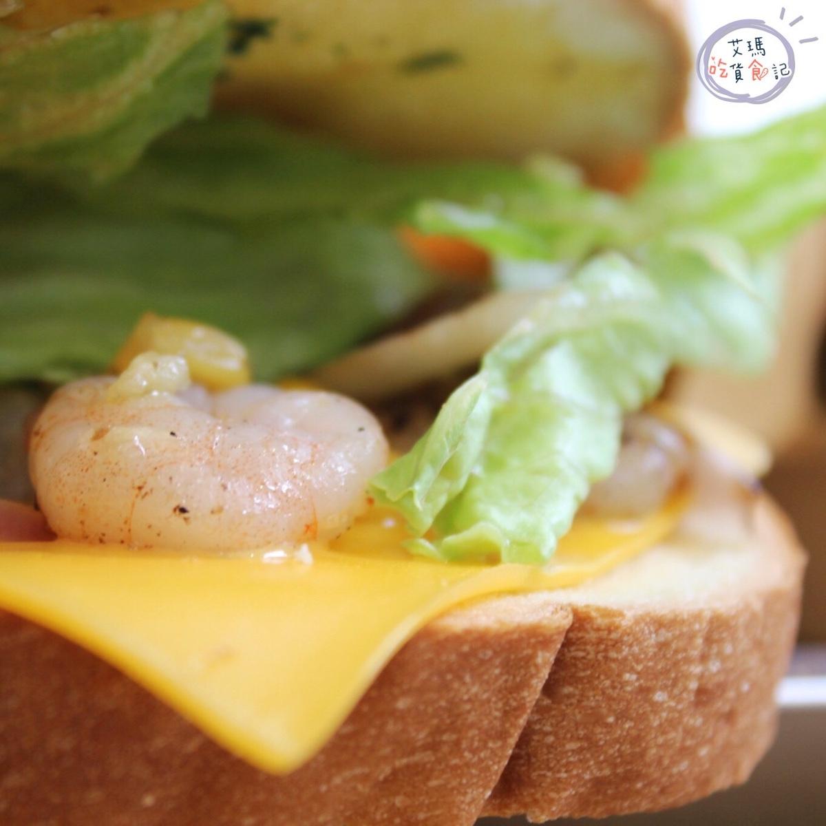 外酥內軟的厚實吐司抹上闆娘自己手工製作的香蒜奶油抹醬,吃起來有奶油香氣帶點適中的蒜香,一口咬下還可以吃到彈牙的蝦仁及新鮮結球萵苣還有甜甜玉米粒,這個口味愛吃蒜的本人激推👍🏻👍🏻👍🏻