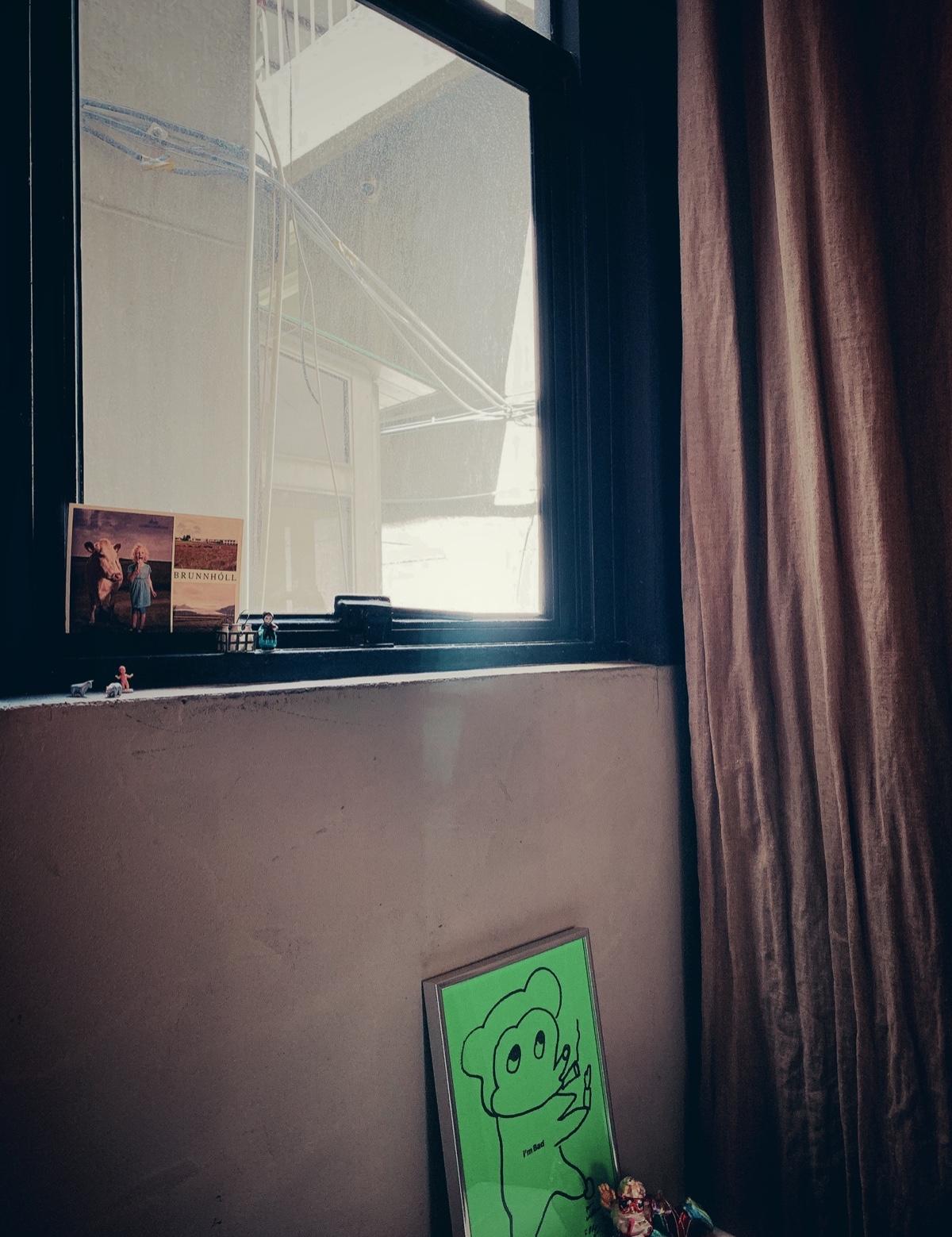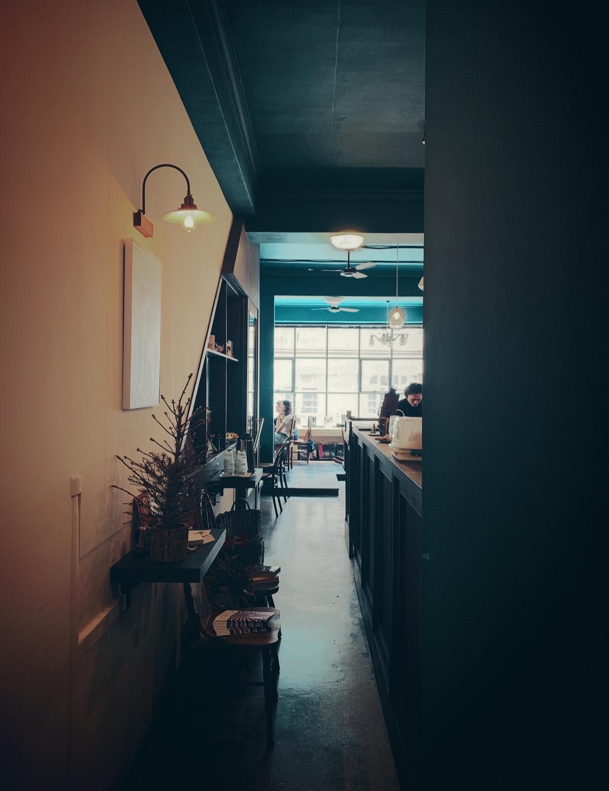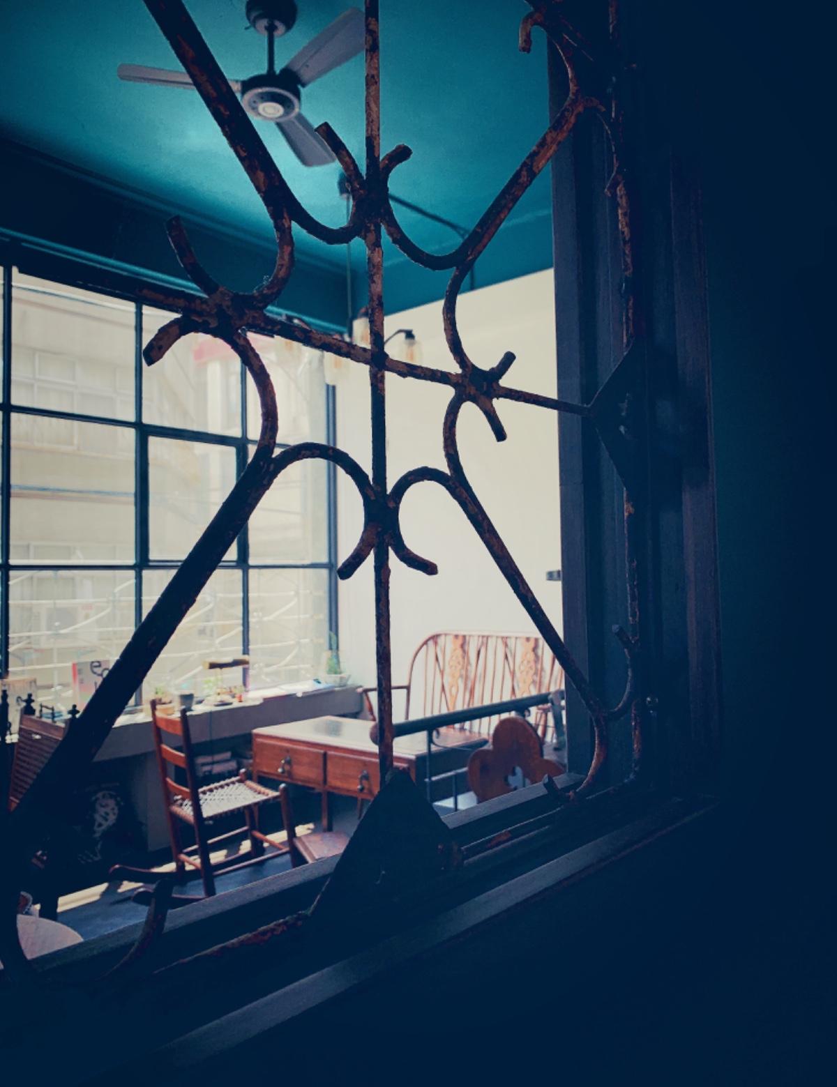 既然是老屋咖啡,除了格局就是狹長型的挑高空間外,室內設計從桌椅到隔間也都是用舊傢俱依照老闆的美學佈置的,每個角落都好美。但因為我去的時候靠窗的位置都坐滿了,我不好意思拍照,只能從隔間的舊鐵花窗往窗口拍了一張。