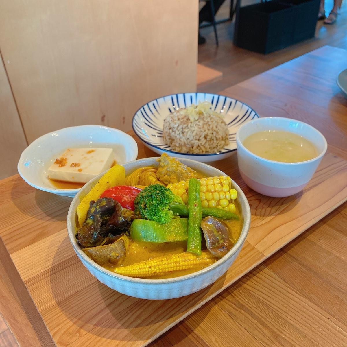 主餐品項都是滿滿的蔬菜,以喜歡吃蔬菜的你是在適合不過了!這次小編點的是南洋湯咖哩,想說咖喱比較不會有太大差異不容易踩雷,沒想到口味上蠻不習慣,但是最讓我震驚的是裡面放有花生糖,這個真的是最不能接受的地方,最後旁邊的配菜我都吃完了,最重要的那碗咖喱我剩了大概快一半,我自己很沒辦法接受啦~