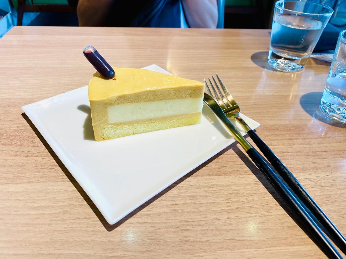 甜點櫃有多種選擇,剛好聽到店員在跟別的客人介紹,他們店的招牌是「水果千層」,果然非常熱銷,下午ㄧ點時就已經都賣完了,但筆者個人不愛水果也不愛千層類的蛋糕,果斷選擇了看起來沒什麼特色的焦糖布丁蛋糕~