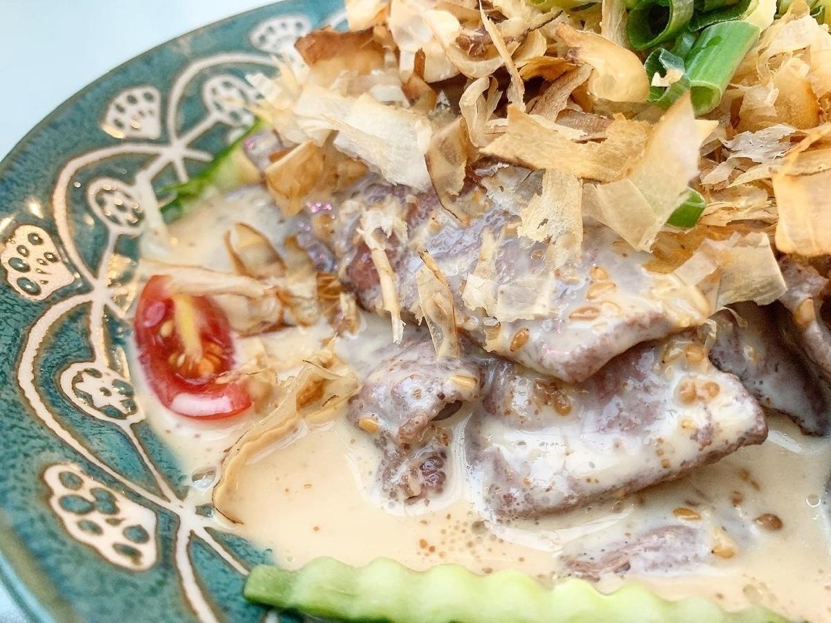 牛肉炙燒後再切片,片片軟嫩可口,蘸了胡麻風味鹹中帶甜特別美味❤️