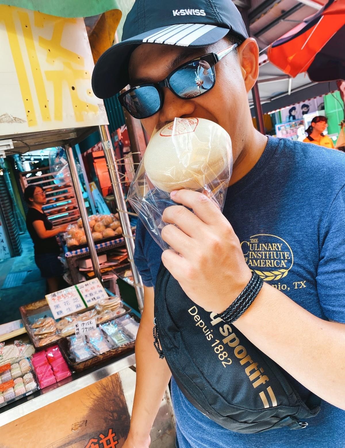 安平老街內蠻有特色的便是這小點心,俗稱「椪餅」或「凸餅」的地方點心「香餅」歷史超過百年,這個遵循古法製成的古早味糕點,原本是神明壽誕的祭祀供品,也是早年婦女坐月子時吃的餅食,現在則成為台南的特色點心。椪餅以白糖、黑糖作為內餡,香氣十足,所以又稱作「香餅」,也有人以香餅圓圓、膨膨的外貌,把它稱為「椪餅」。─《擷取自自由時報網頁》