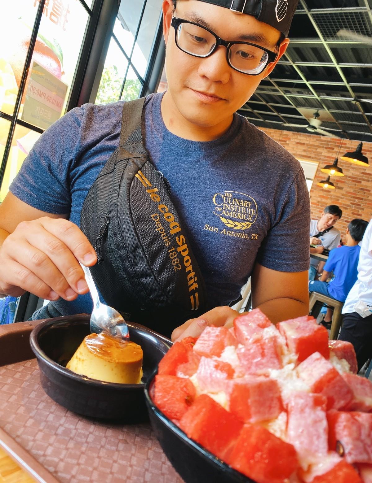 我們被它的店門口裝潢給吸引,以紅磚牆及內部工業風設計,冰品也是常見選項→布丁牛奶、芒果牛奶、西瓜牛奶等,我們選擇西瓜牛奶冰,老實說真的很雷,因為西瓜不夠甜,煉乳卻又加得不夠多,而且一盤100多元,每人都要有低消不能分,所以點了個布丁,店家自製布丁口感太軟爛、雞蛋味無、很不好吃。