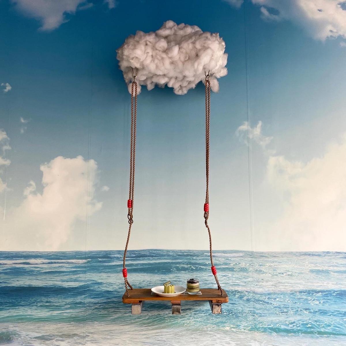 小雲朵甜點工作室藏在南屯大進街上,店家不是太顯眼,不小心就會錯過,仔細看才會發現一片藍色的網美牆,還有個小鞦韆,真的會有人坐上來拍照,甜點是主角讓兩個抹茶品項扮網美就好~