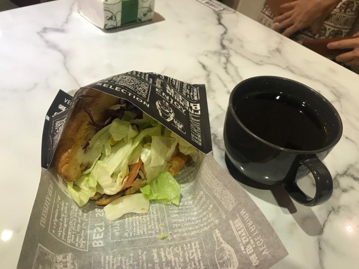 潛水堡選了99元的G胸肉可頌,内夾蕃茄丶黃瓜🥒、紫高麗菜和玉米粒🌽四種配料,淋上青檸沙拉醬🍋吃起來意外的清爽,附紅茶一杯。