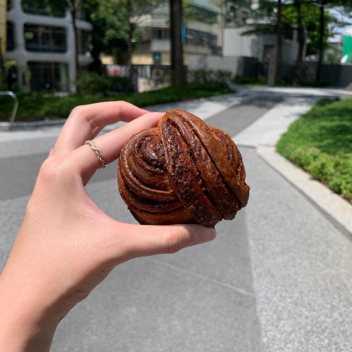 璞家的肉桂捲差不多一個手掌的大小,酥脆的外皮帶著烤過的焦糖香氣,內層鬆軟有較勁,肉桂味適中但不辛辣,酸種感不明顯,編織肉桂捲增加口感的層次,私心希望如果可以再濕潤一點會更完美。