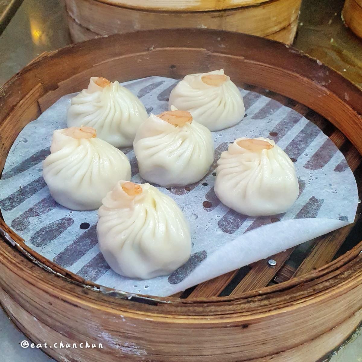 現點現蒸的鮮蝦湯包,皮薄餡滿又多汁,上頭還有一整隻的蝦仁。搭配他們的醬油、薑絲跟辣醬,真的很好吃!不過價格偏高,份量不大,六顆吃完還是有點空虛呀😅