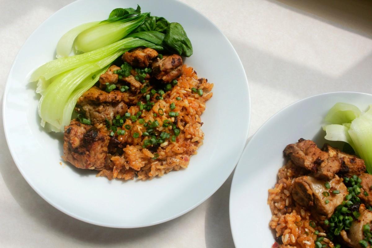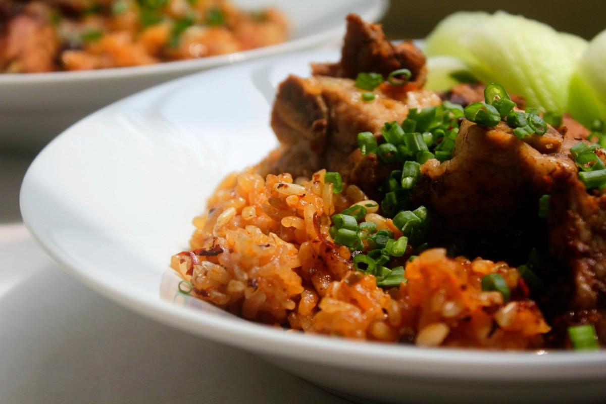 外鍋1.5杯水,按下開關,坐等吃飯。這時候可以悠哉地燙個青菜來配。電鍋跳起後多燜10分鐘再開蓋。排骨先夾出來,把飯拌一拌。